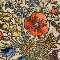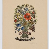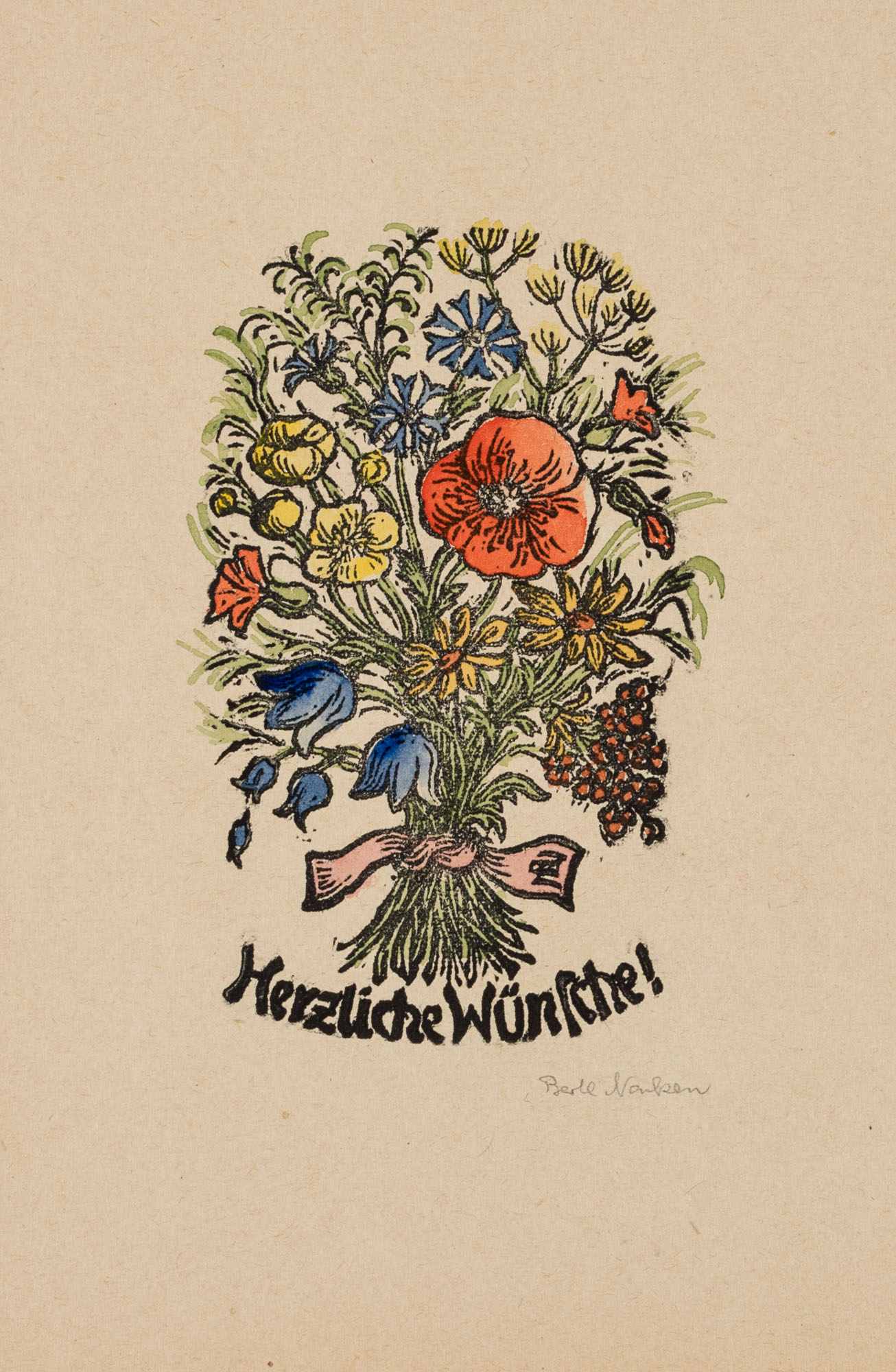 Berte Nacken (20. Jahrhundert), Glückwunschkarte mit Blumenbouquet aus Wiesenblumen, Glockenblume, Mohnblume, Dill, Nelke, um 1940, Holzschnitt