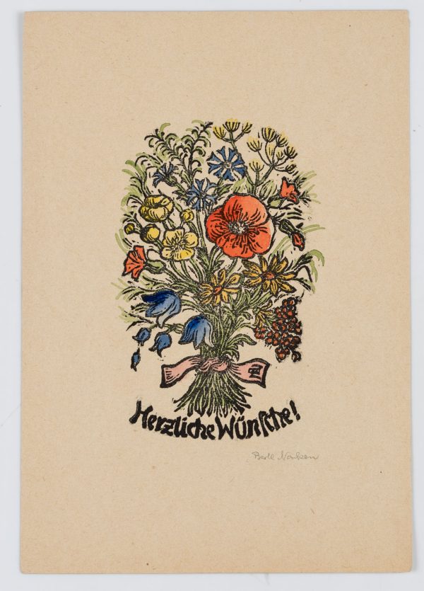 - Beschreibung: Unter der Graphik beschriftet mit “Herzliche Wünsche!”, rechts darunter signiert mit “Berte Nacken”.
