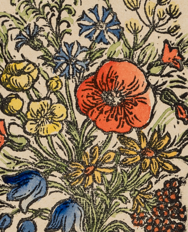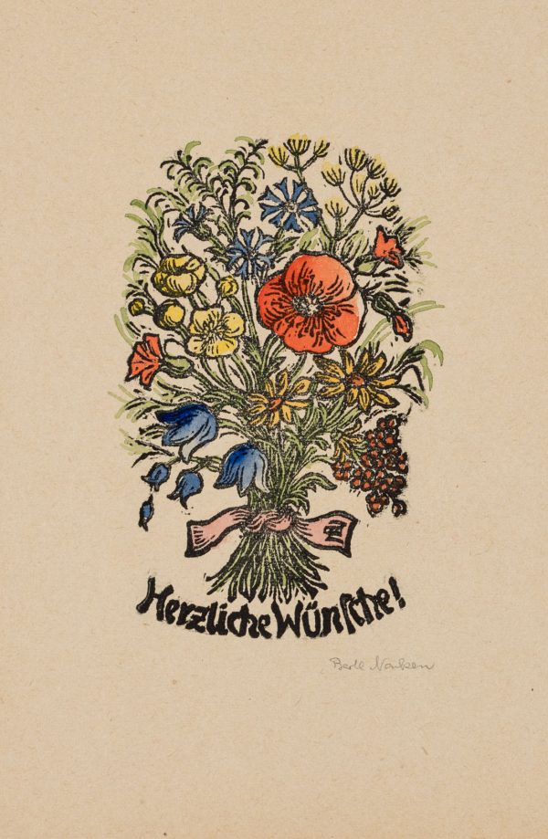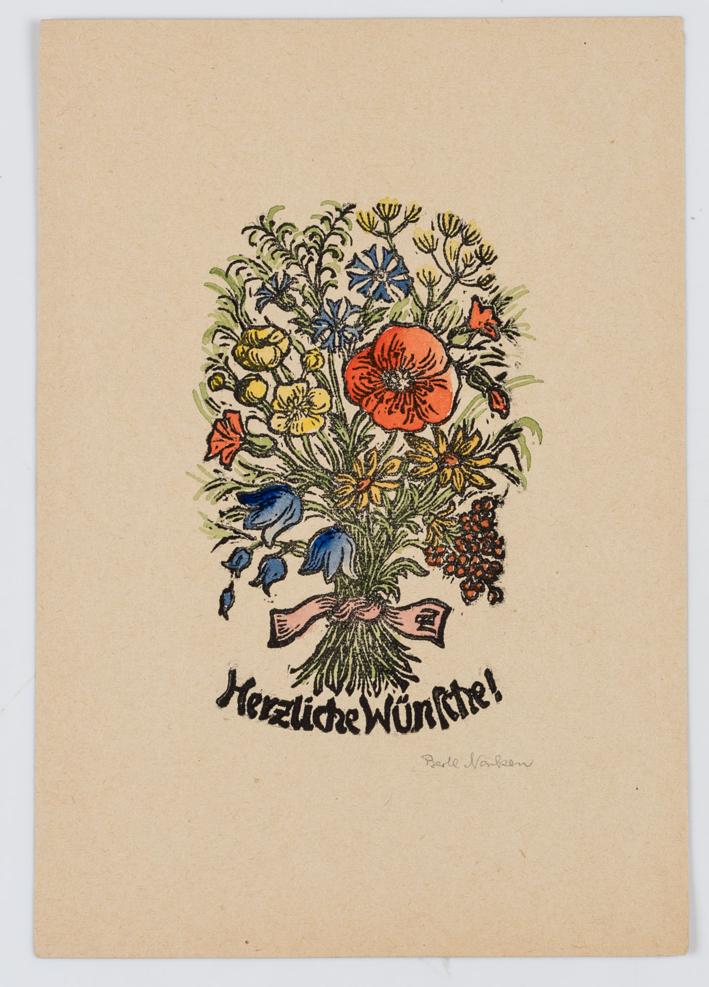 Berte Nacken (20th century), Greeting card with flower bouquet of meadow flowers, bellflower, poppy, dill, carnation, c. 1940, Woodcut
