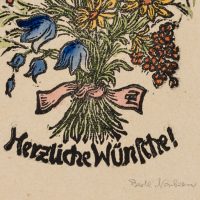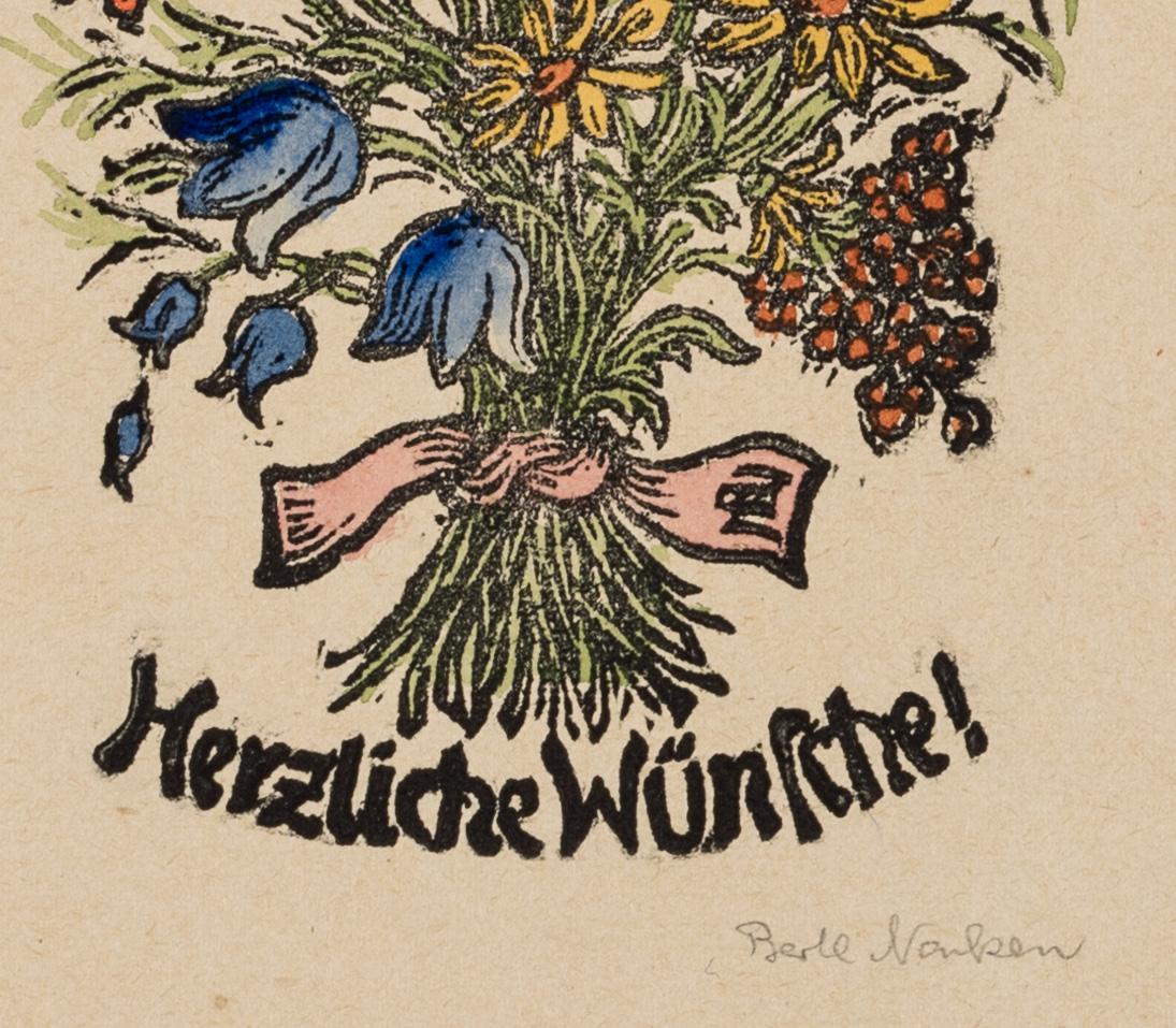 - Description: Inscribed below the print with “Herzliche Wünsche!”, signed on the right below with “Berte Nacken”.