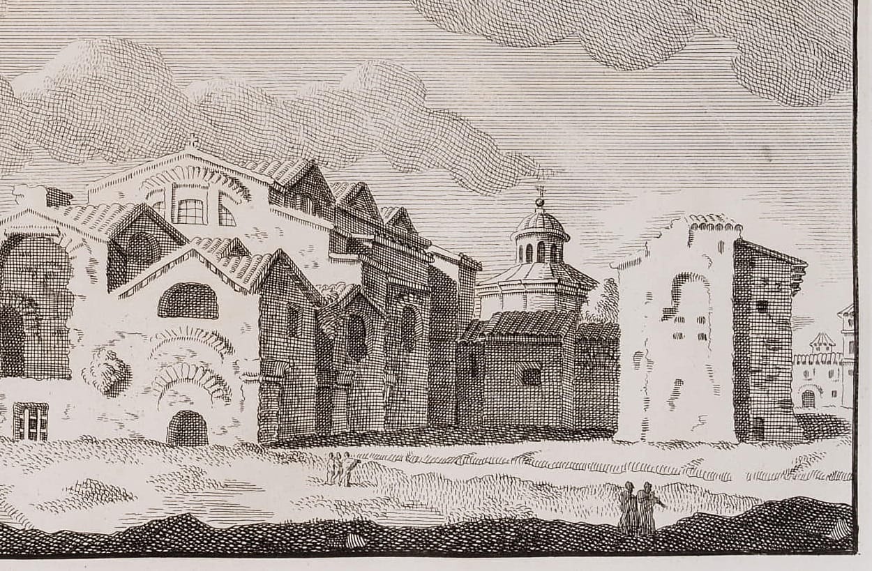 Bonaventura van Overbeke (1660 Amsterdam – 1705 ebd.), Les Bains de Diocletion, Ansicht der Diokletiansthermen in Rom, 1709, Radierung