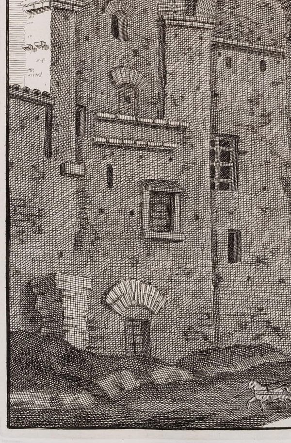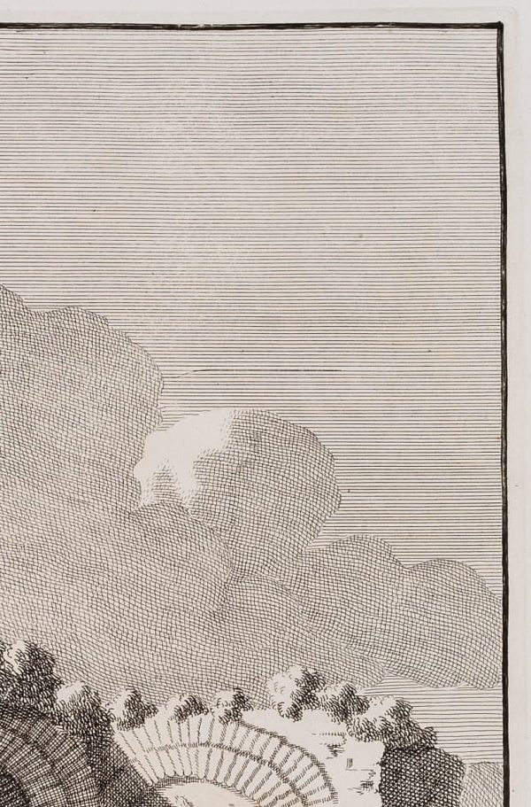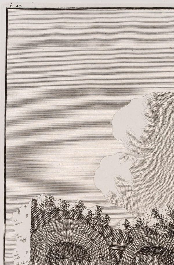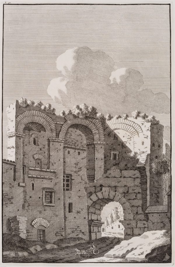 - Description: Beautiful architectural illustration from the French-language compendium of Bonaventura van Overbeke with Roman buildings of antiquity. The large engraving work first appeared in Latin in 1708 and was republished in a French translation in 1709. The etchings were all published posthumously by the artist’s cousin Michiel van Overbeke. They are characterised by a high level of detail in their reproduction. Staffage figures are often added to the architectural views to illustrate the proportions of the ancient monuments.