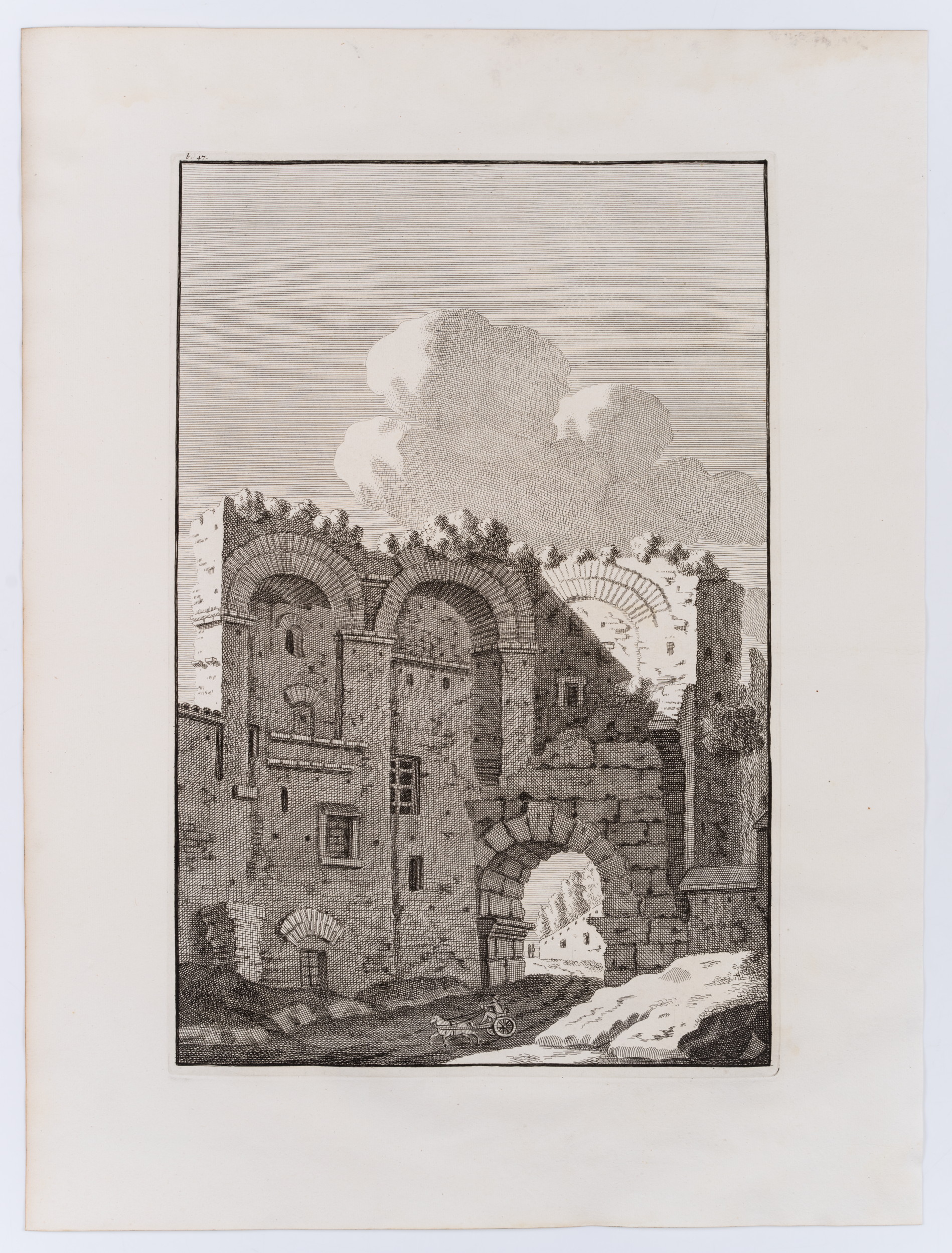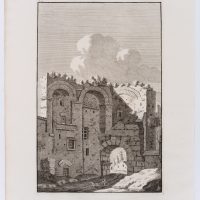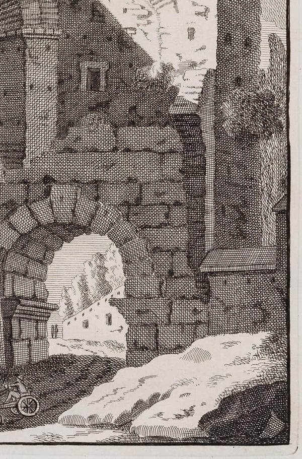 - Beschreibung: Schöne Architekturdarstellung aus dem französischsprachigen Kompendium des Bonaventura van Overbeke mit römischen Bauwerken der Antike. Das große Stichwerk erschien erstmals 1708 in lateinischer Sprache und wurde 1709 in einer französischen Übersetzung erneut herausgegeben. Die Radierungen wurden alle posthum durch den Cousin des Künstlers, Michiel van Overbeke, herausgegeben. Sie zeichnen sich durch eine hohe Detailtreue der Wiedergabe aus. Oftmals sind den architektonischen Ansichten Staffagefiguren beigegeben, die die Größenverhältnisse zu den antiken Monumenten illustrieren.