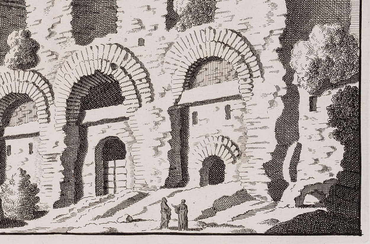 - Description: Beautiful architectural illustration from the French-language compendium of Bonaventura van Overbeke with Roman buildings of antiquity. The large engraving work first appeared in Latin in 1708 and was republished in a French translation in 1709. The etchings were all published posthumously by the artist’s cousin Michiel van Overbeke. They are characterised by a high level of detail in their reproduction. Staffage figures are often added to the architectural views to illustrate the proportions of the ancient monuments.