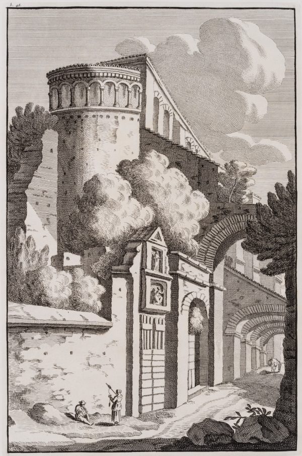 • Description: Beautiful architectural illustration from the French-language compendium of Bonaventura van Overbeke with Roman buildings of antiquity. The large engraving work first appeared in Latin in 1708 and was republished in a French translation in 1709. The etchings were all published posthumously by the artist’s cousin Michiel van Overbeke. They are characterised by a high level of detail in their reproduction. Staffage figures are often added to the architectural views to illustrate the proportions of the ancient monuments.