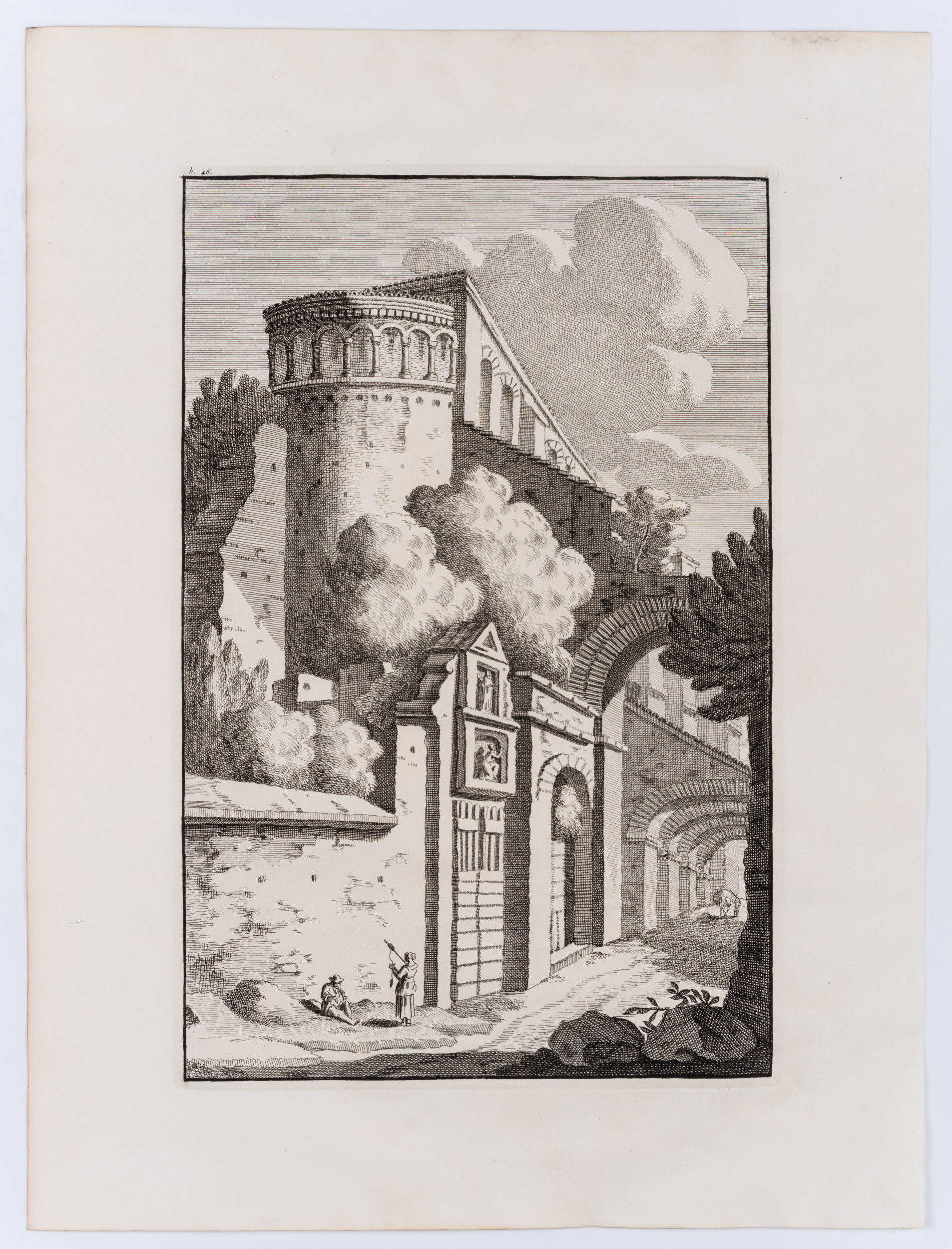 Schöne Architekturdarstellung aus dem französischsprachigen Kompendium des Bonaventura van Overbeke mit römischen Bauwerken der Antike. Das große Stichwerk erschien erstmals 1708 in lateinischer Sprache und wurde 1709 in einer französischen Übersetzung erneut herausgegeben. Die Radierungen wurden alle posthum durch den Cousin des Künstlers, Michiel van Overbeke, herausgegeben. Sie zeichnen sich durch eine hohe Detailtreue der Wiedergabe aus. Oftmals sind den architektonischen Ansichten Staffagefiguren beigegeben, die die Größenverhältnisse zu den antiken Monumenten illustrieren.
