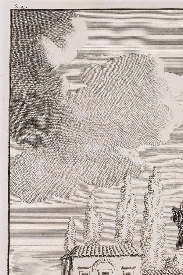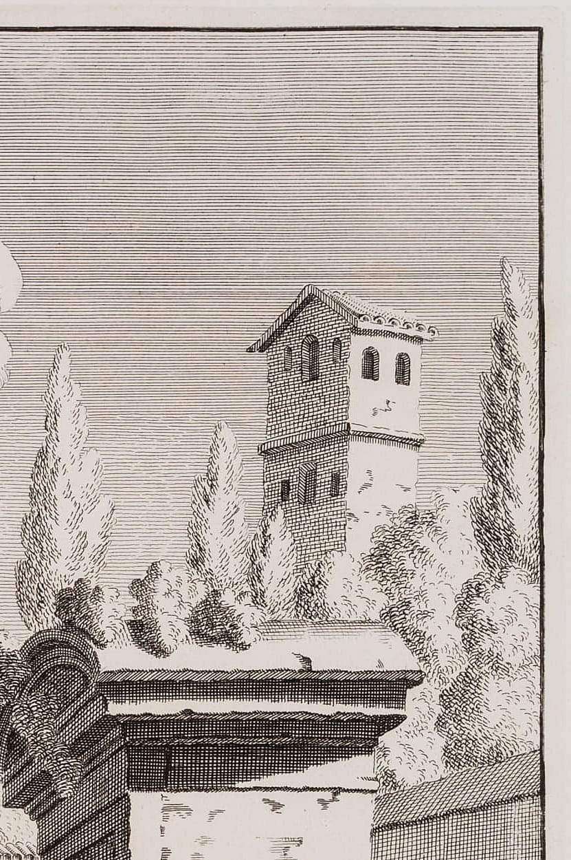 - Description: Beautiful architectural illustration from the French-language compendium of Bonaventura van Overbeke with Roman buildings of antiquity. The large engraving work first appeared in Latin in 1708 and was republished in a French translation in 1709. The etchings were all published posthumously by the artist’s cousin Michiel van Overbeke. They are characterised by a high level of detail in their reproduction. Staffage figures are often added to the architectural views to illustrate the proportions of the ancient monuments.