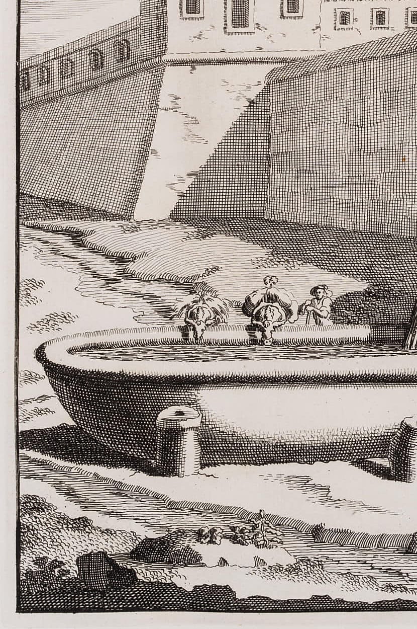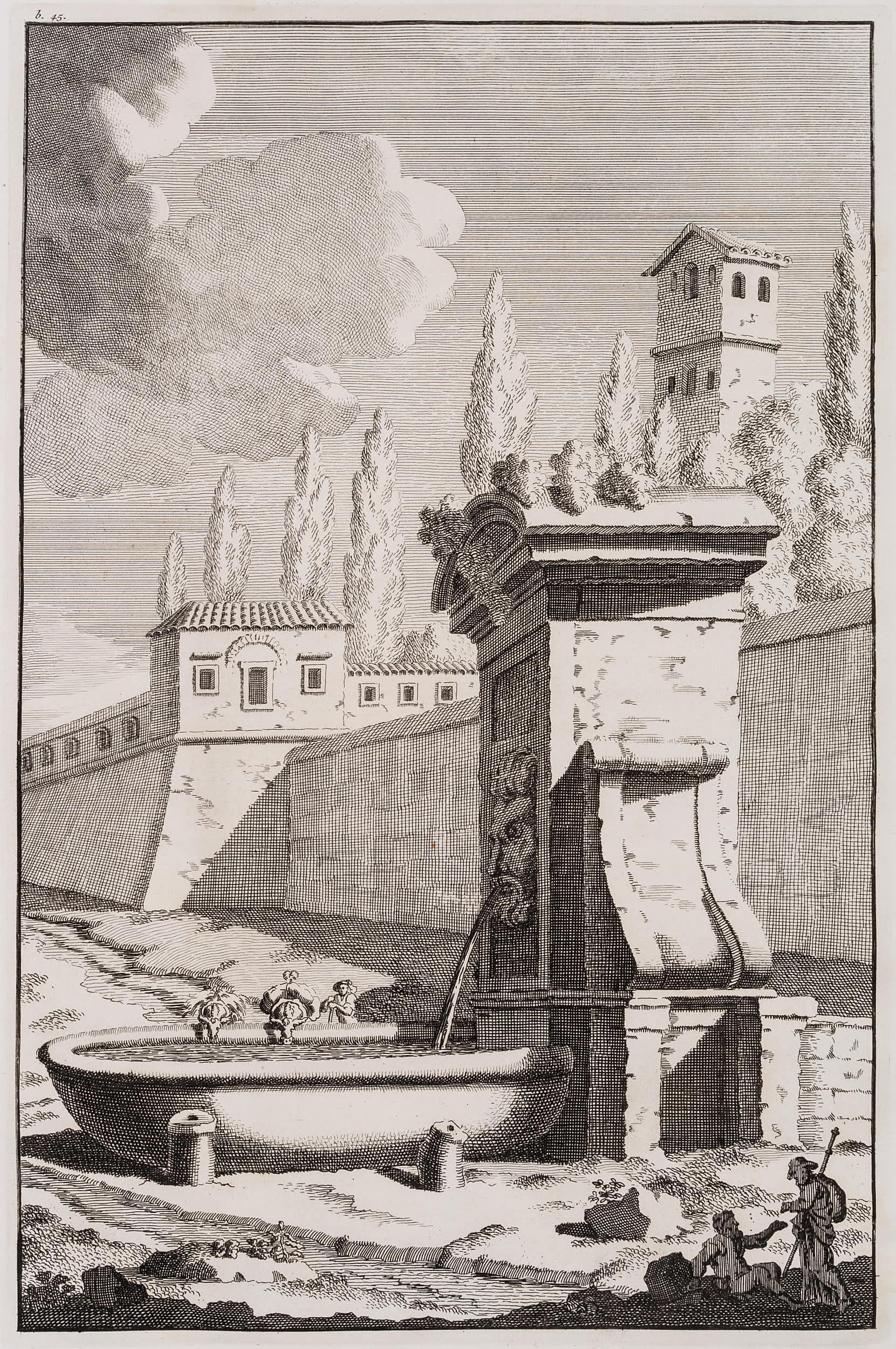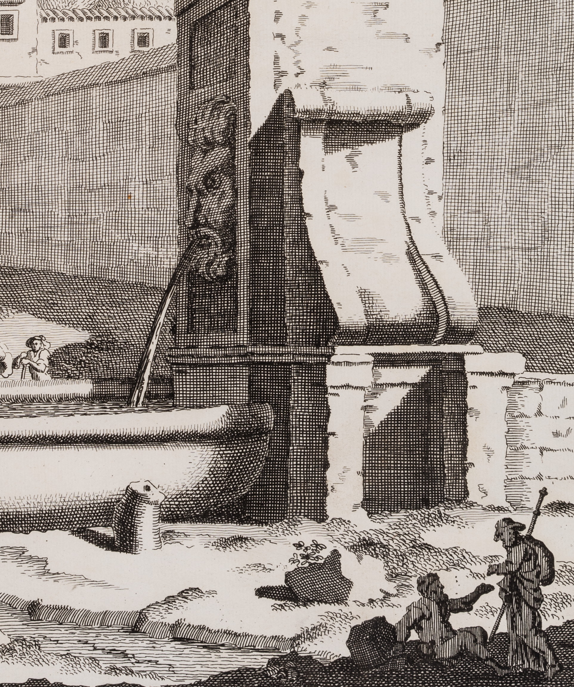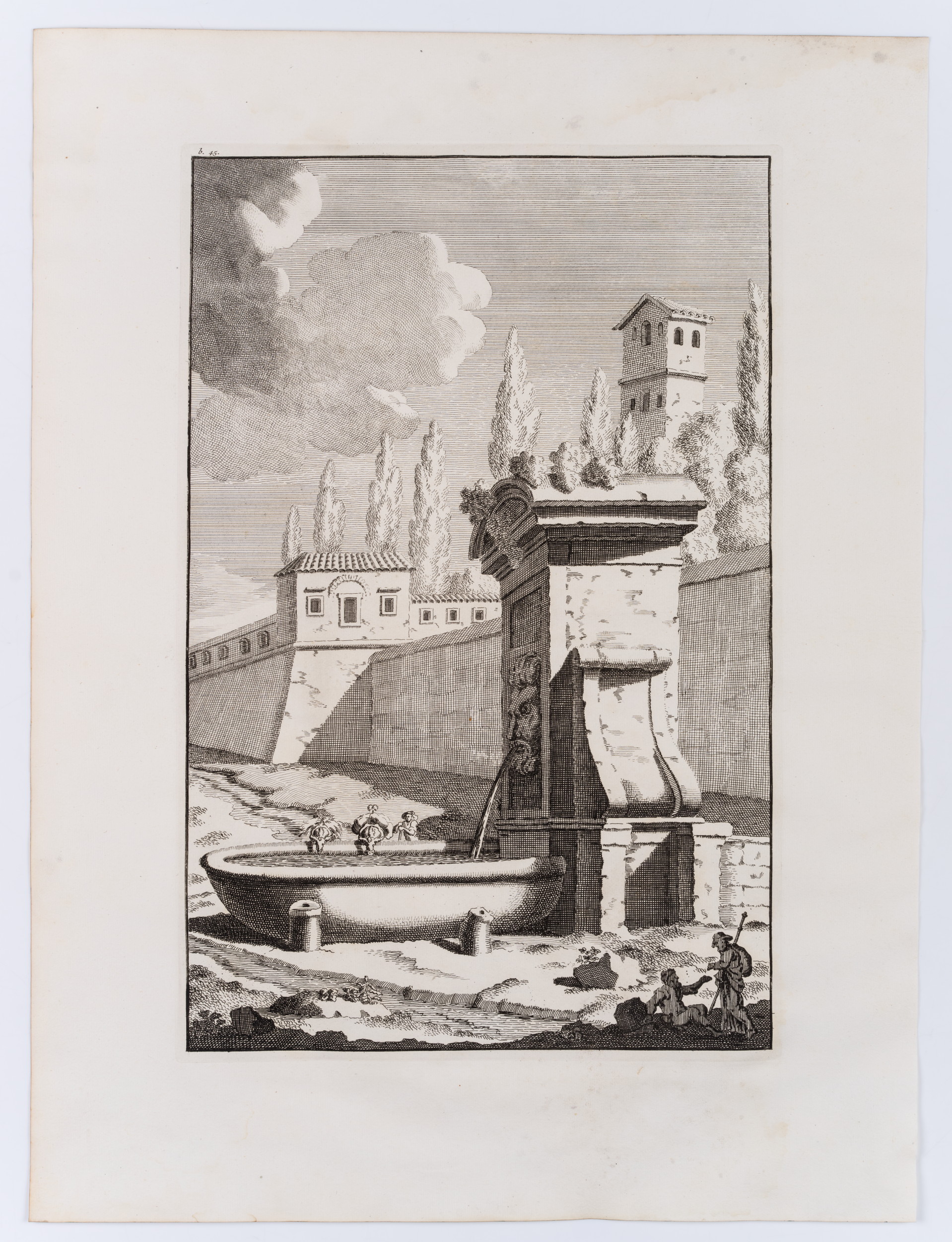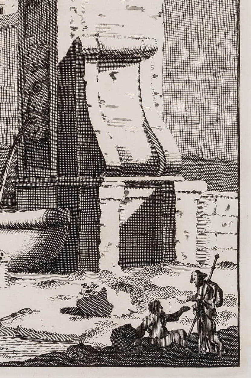 Bonaventura van Overbeke (1660 Amsterdam – 1705 ebd.), La Fontaine Antique sur le Place Romain, Antiker Brunnen in Rom, 1709, Radierung
