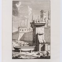 - Beschreibung: Schöne Architekturdarstellung aus dem französischsprachigen Kompendium des Bonaventura van Overbeke mit römischen Bauwerken der Antike. Das große Stichwerk erschien erstmals 1708 in lateinischer Sprache und wurde 1709 in einer französischen Übersetzung erneut herausgegeben. Die Radierungen wurden alle posthum durch den Cousin des Künstlers, Michiel van Overbeke, herausgegeben. Sie zeichnen sich durch eine hohe Detailtreue der Wiedergabe aus. Oftmals sind den architektonischen Ansichten Staffagefiguren beigegeben, die die Größenverhältnisse zu den antiken Monumenten illustrieren.
