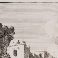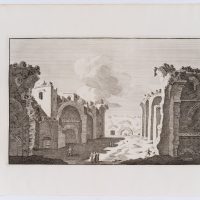 - Beschreibung: Schöne Architekturdarstellung aus dem französischsprachigen Kompendium des Bonaventura van Overbeke mit römischen Bauwerken der Antike. Das große Stichwerk erschien erstmals 1708 in lateinischer Sprache und wurde 1709 in einer französischen Übersetzung erneut herausgegeben. Die Radierungen wurden alle posthum durch den Cousin des Künstlers, Michiel van Overbeke, herausgegeben. Sie zeichnen sich durch eine hohe Detailtreue der Wiedergabe aus. Oftmals sind den architektonischen Ansichten Staffagefiguren beigegeben, die die Größenverhältnisse zu den antiken Monumenten illustrieren.