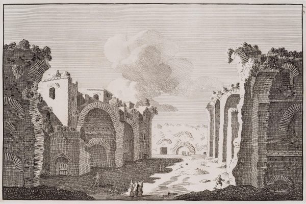 - Description: Beautiful architectural illustration from the French-language compendium of Bonaventura van Overbeke with Roman buildings of antiquity. The large engraving work first appeared in Latin in 1708 and was republished in a French translation in 1709. The etchings were all published posthumously by the artist’s cousin Michiel van Overbeke. They are characterised by a high level of detail in their reproduction. Staffage figures are often added to the architectural views to illustrate the proportions of the ancient monuments.