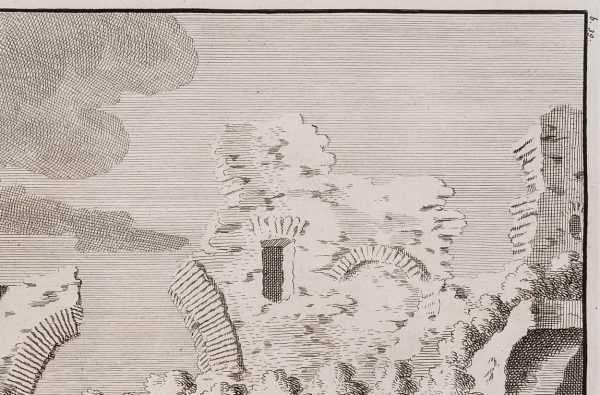 Schöne Architekturdarstellung aus dem französischsprachigen Kompendium des Bonaventura van Overbeke mit römischen Bauwerken der Antike. Das große Stichwerk erschien erstmals 1708 in lateinischer Sprache und wurde 1709 in einer französischen Übersetzung erneut herausgegeben. Die Radierungen wurden alle posthum durch den Cousin des Künstlers, Michiel van Overbeke, herausgegeben. Sie zeichnen sich durch eine hohe Detailtreue der Wiedergabe aus. Oftmals sind den architektonischen Ansichten Staffagefiguren beigegeben, die die Größenverhältnisse zu den antiken Monumenten illustrieren.