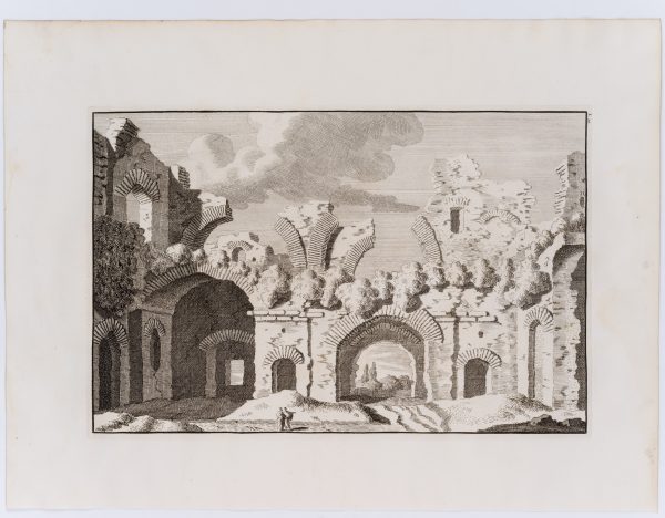 • Description: Beautiful architectural illustration from the French-language compendium of Bonaventura van Overbeke with Roman buildings of antiquity. The large engraving work first appeared in Latin in 1708 and was republished in a French translation in 1709. The etchings were all published posthumously by the artist’s cousin Michiel van Overbeke. They are characterised by a high level of detail in their reproduction. Staffage figures are often added to the architectural views to illustrate the proportions of the ancient monuments.
