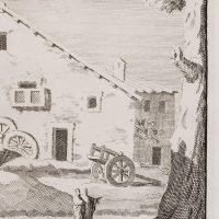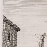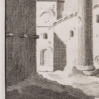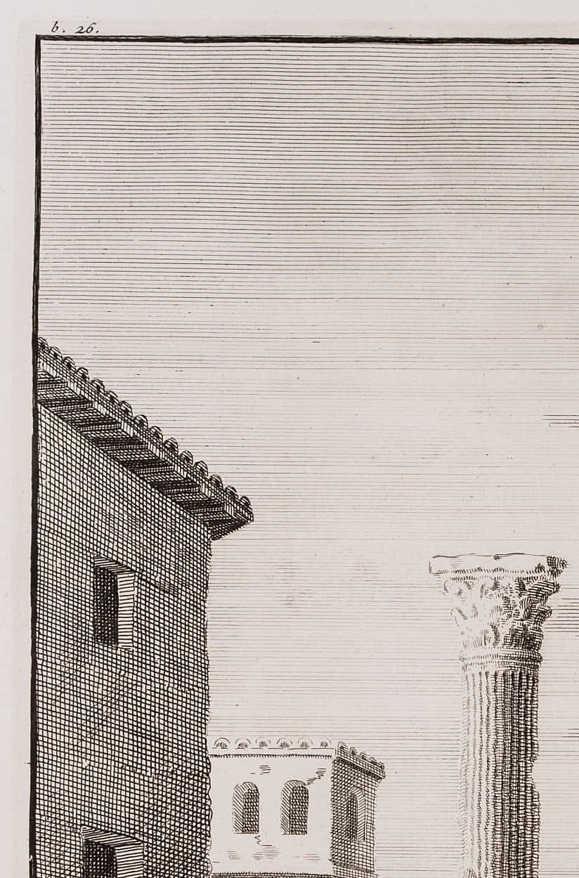 - Beschreibung: Schöne Architekturdarstellung aus dem französischsprachigen Kompendium des Bonaventura van Overbeke mit römischen Bauwerken der Antike. Das große Stichwerk erschien erstmals 1708 in lateinischer Sprache und wurde 1709 in einer französischen Übersetzung erneut herausgegeben. Die Radierungen wurden alle posthum durch den Cousin des Künstlers, Michiel van Overbeke, herausgegeben. Sie zeichnen sich durch eine hohe Detailtreue der Wiedergabe aus. Oftmals sind den architektonischen Ansichten Staffagefiguren beigegeben, die die Größenverhältnisse zu den antiken Monumenten illustrieren.