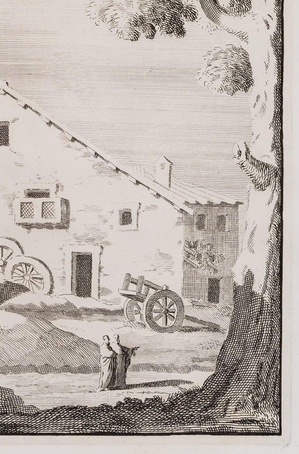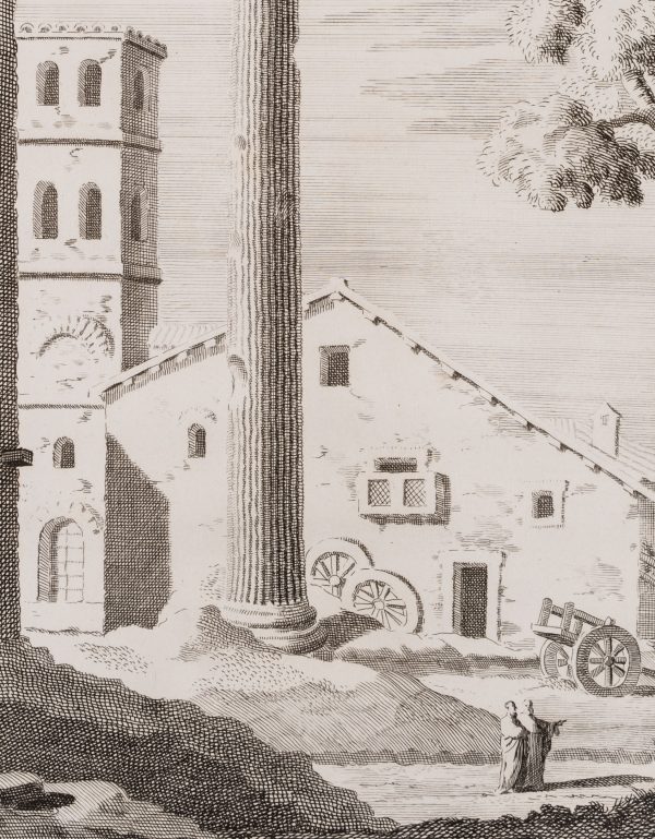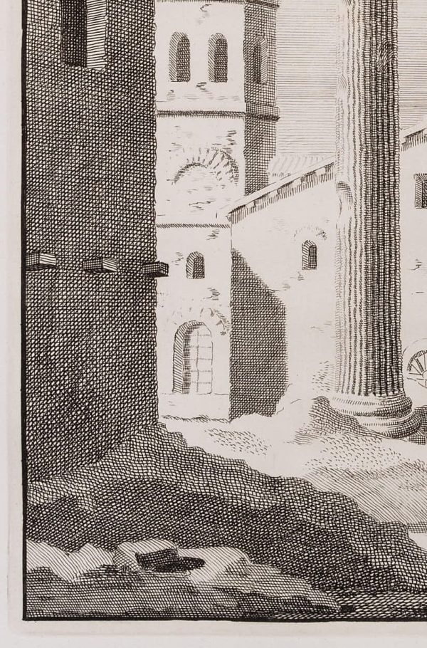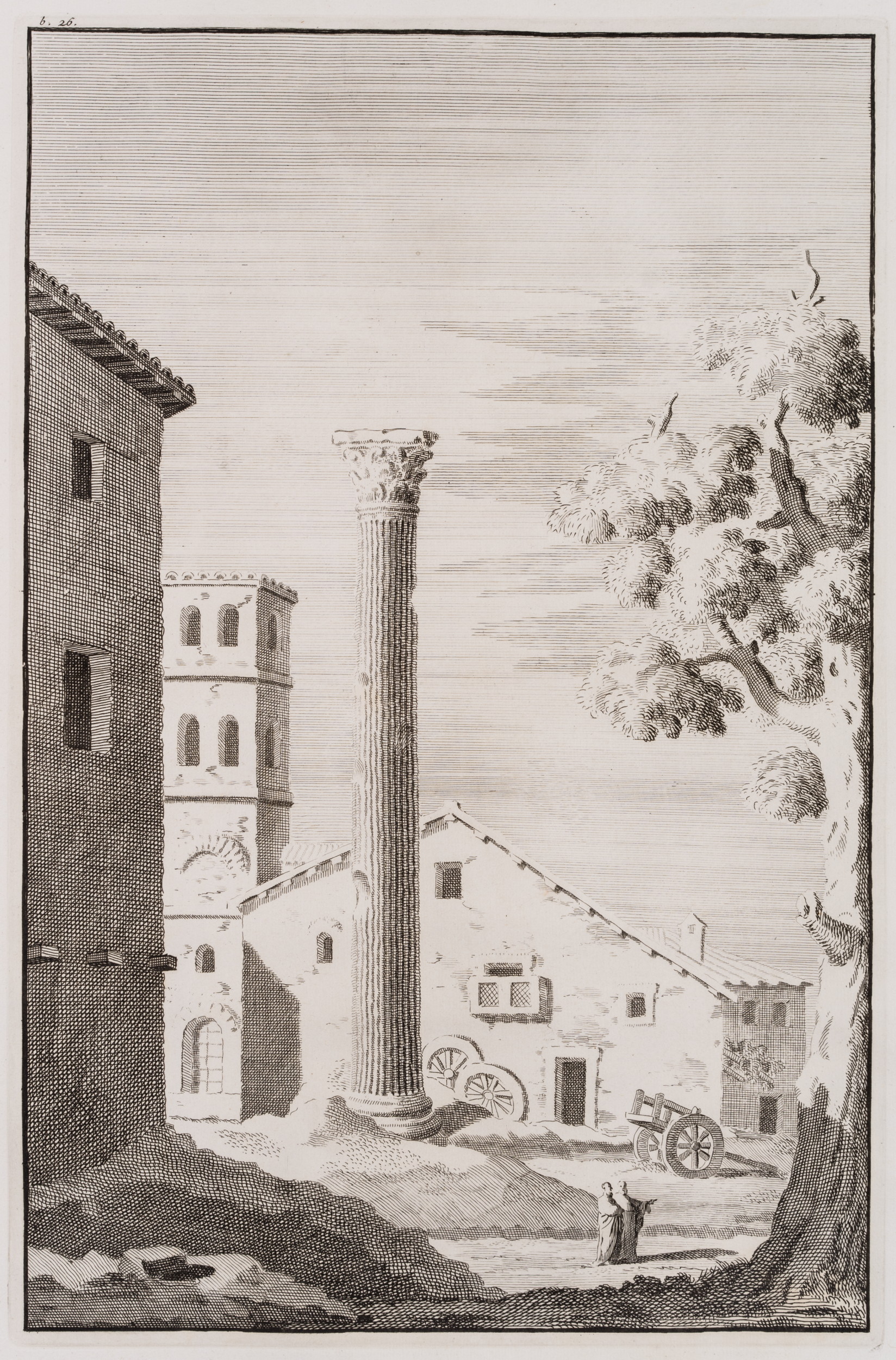 - Description: Beautiful architectural illustration from the French-language compendium of Bonaventura van Overbeke with Roman buildings of antiquity. The large engraving work first appeared in Latin in 1708 and was republished in a French translation in 1709. The etchings were all published posthumously by the artist’s cousin Michiel van Overbeke. They are characterised by a high level of detail in their reproduction. Staffage figures are often added to the architectural views to illustrate the proportions of the ancient monuments.