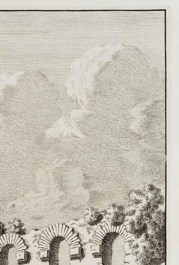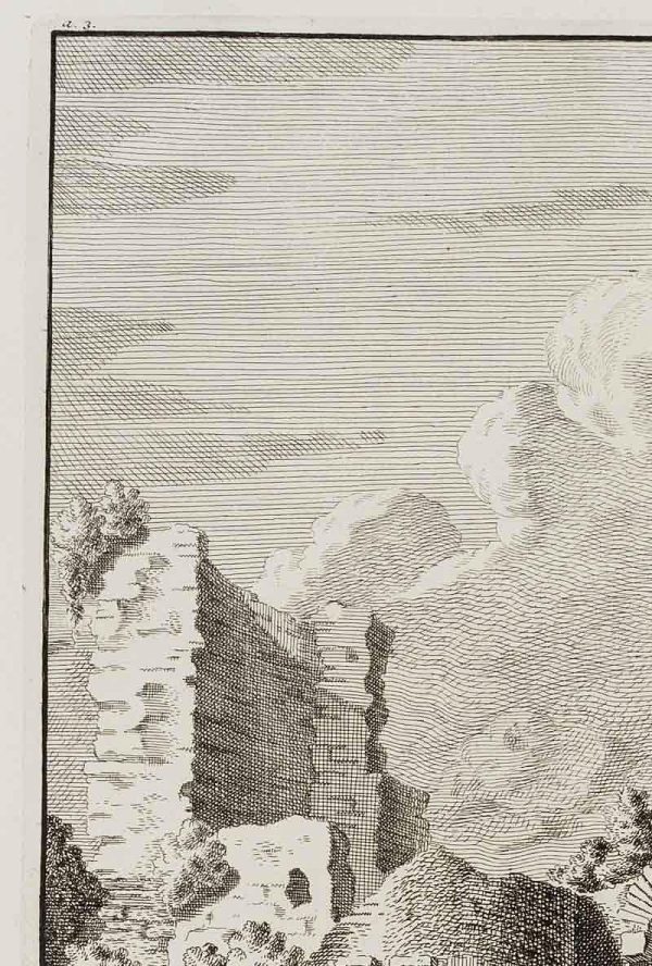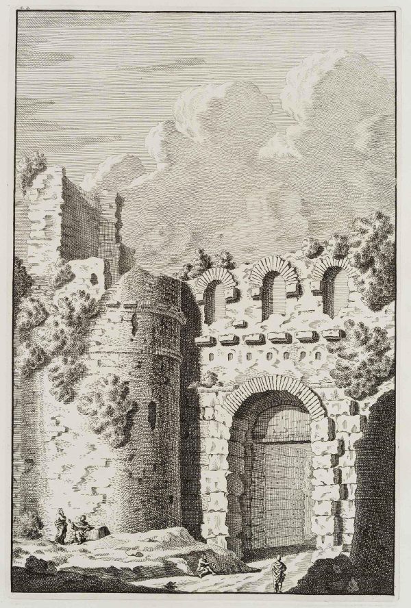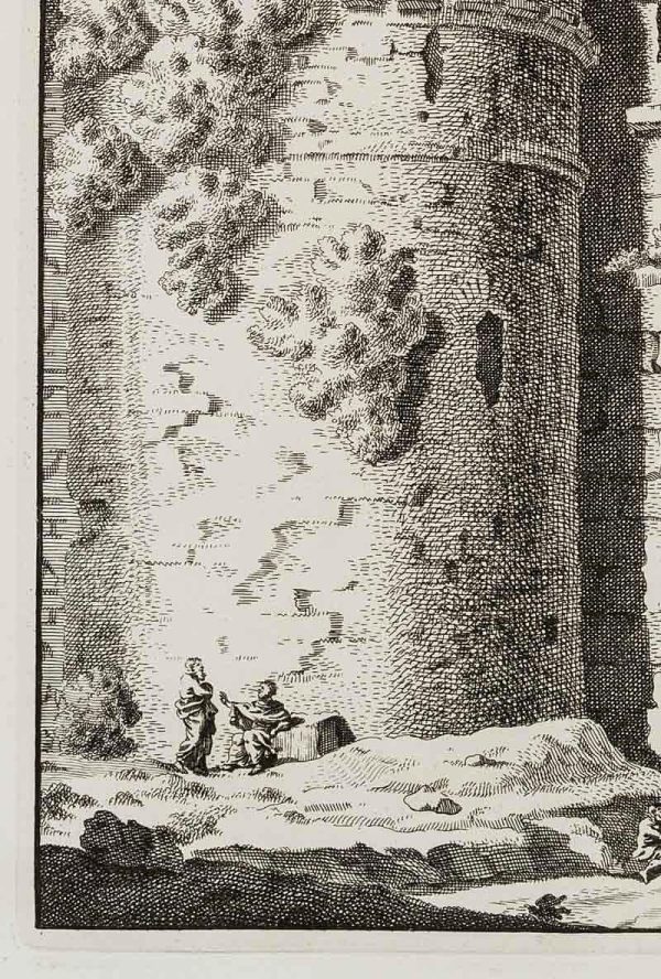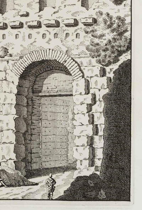 - Description: Beautiful architectural illustration from the French-language compendium of Bonaventura van Overbeke with Roman buildings of antiquity. The large engraving work first appeared in Latin in 1708 and was republished in a French translation in 1709. The etchings were all published posthumously by the artist’s cousin Michiel van Overbeke. They are characterised by a high level of detail in their reproduction. Staffage figures are often added to the architectural views to illustrate the proportions of the ancient monuments.