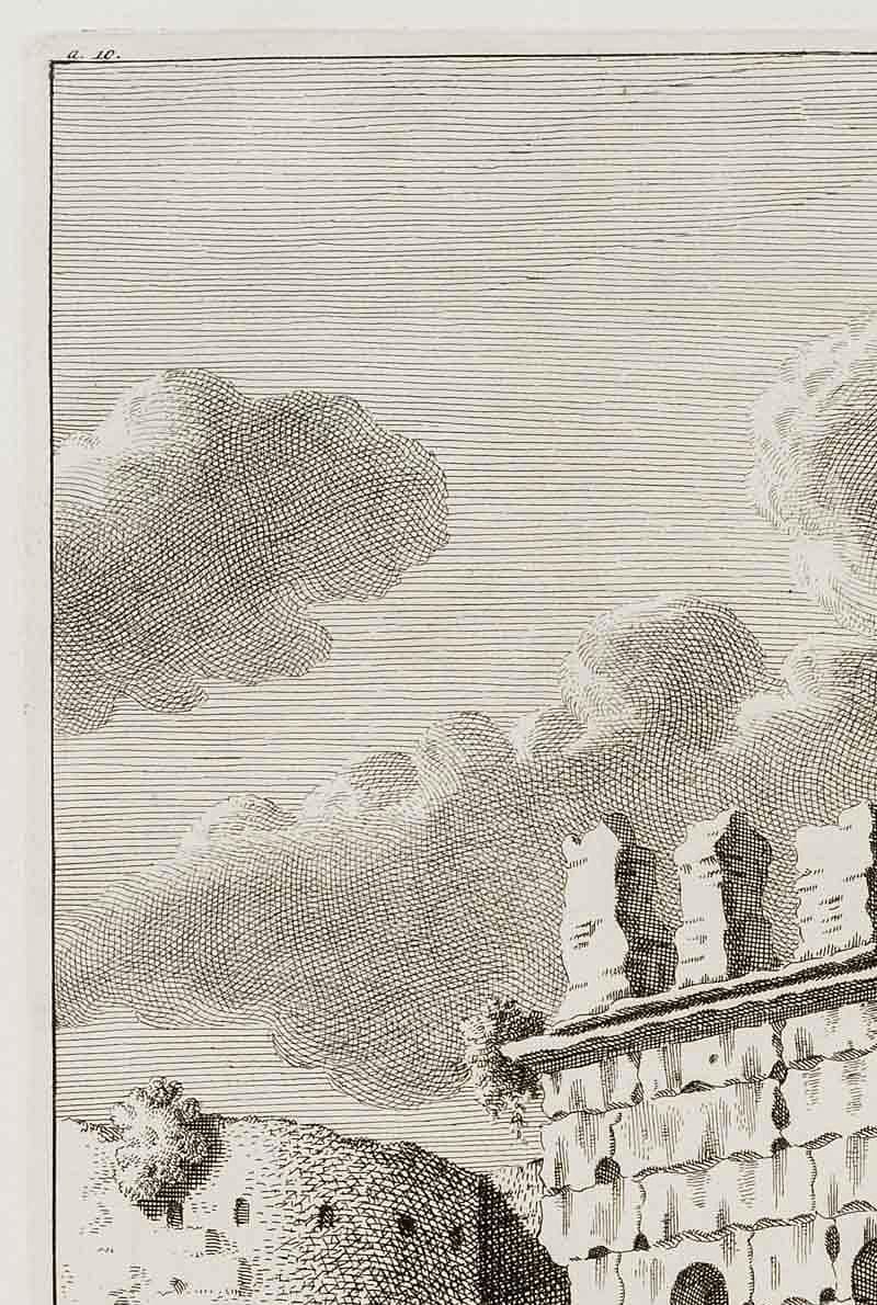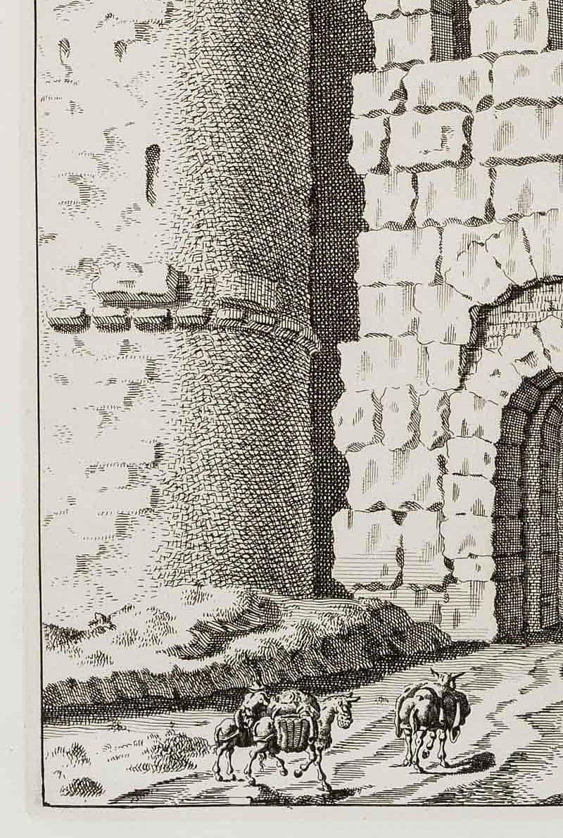 Schöne Architekturdarstellung aus dem französischsprachigen Kompendium des Bonaventura van Overbeke mit römischen Bauwerken der Antike. Das große Stichwerk erschien erstmals 1708 in lateinischer Sprache und wurde 1709 in einer französischen Übersetzung erneut herausgegeben. Die Radierungen wurden alle posthum durch den Cousin des Künstlers, Michiel van Overbeke, herausgegeben. Sie zeichnen sich durch eine hohe Detailtreue der Wiedergabe aus. Oftmals sind den architektonischen Ansichten Staffagefiguren beigegeben, die die Größenverhältnisse zu den antiken Monumenten illustrieren.