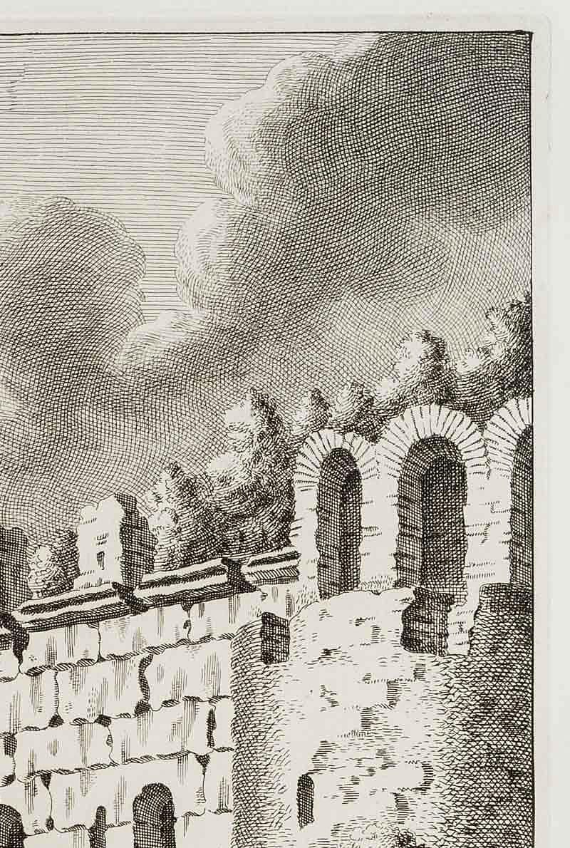 • Description: Beautiful architectural illustration from the French-language compendium of Bonaventura van Overbeke with Roman buildings of antiquity. The large engraving work first appeared in Latin in 1708 and was republished in a French translation in 1709. The etchings were all published posthumously by the artist’s cousin Michiel van Overbeke. They are characterised by a high level of detail in their reproduction. Staffage figures are often added to the architectural views to illustrate the proportions of the ancient monuments.