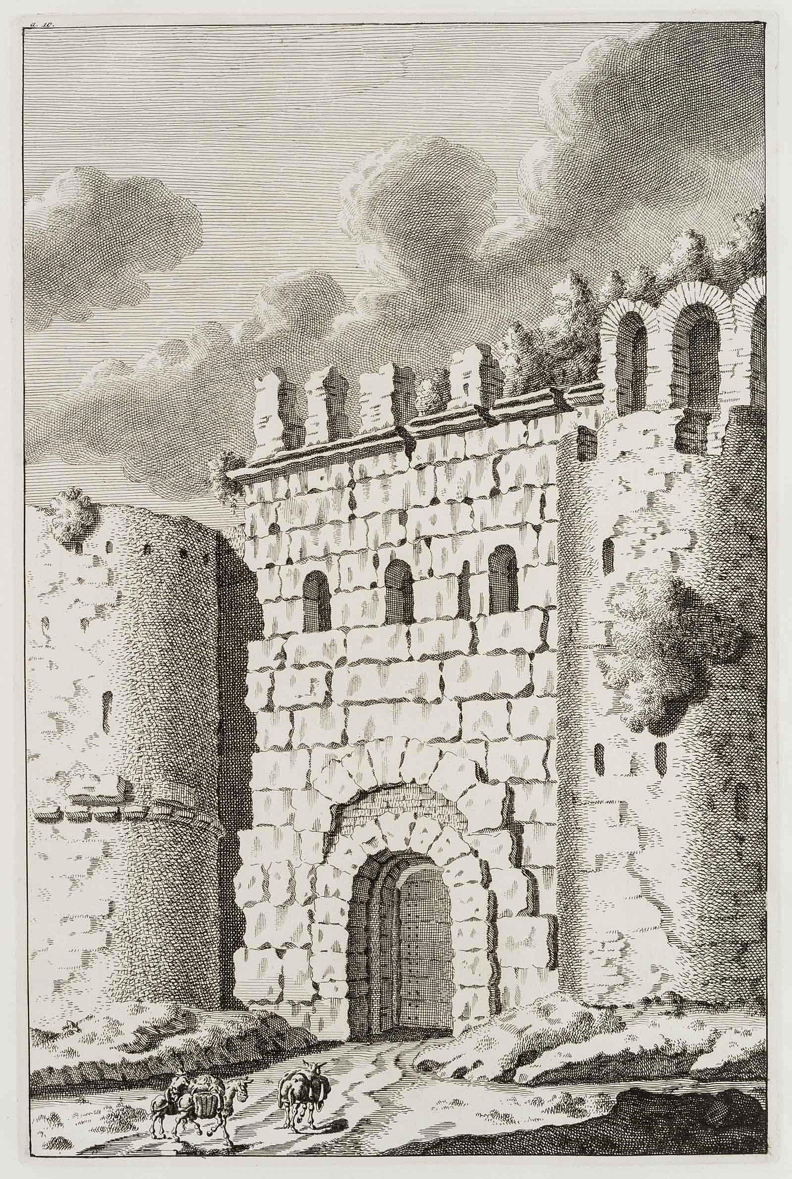 Bonaventura van Overbeke (1660 Amsterdam – 1705 ibid.), Porta Latina in Rom, “The Valerie, Ferentine, Piacular, now Latin Gate”, The Remains Of Ancient Rome, 1709, Etching