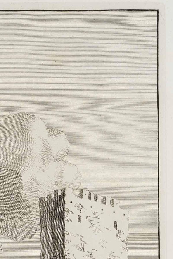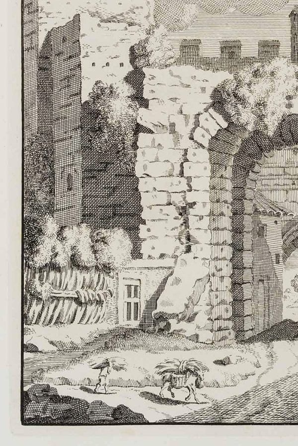 - Description: Beautiful architectural illustration from the French-language compendium of Bonaventura van Overbeke with Roman buildings of antiquity. The large engraving work first appeared in Latin in 1708 and was republished in a French translation in 1709. The etchings were all published posthumously by the artist’s cousin Michiel van Overbeke. They are characterised by a high level of detail in their reproduction. Staffage figures are often added to the architectural views to illustrate the proportions of the ancient monuments.