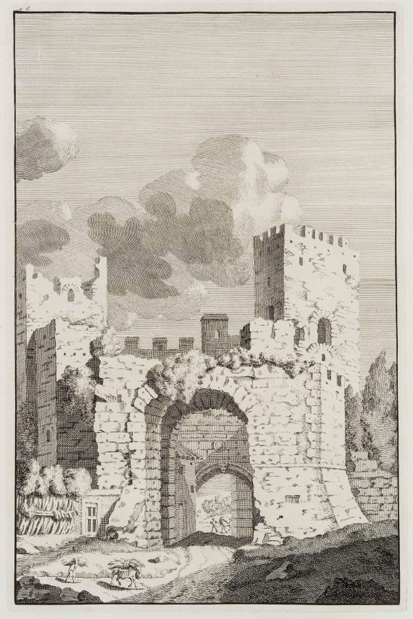 Bonaventura van Overbeke (1660 Amsterdam – 1705 ibid.), Porta Tiburtina (auch Porta San Lorenzo oder Porta Taurina) in Rom, “La Porte Esquiline, Metie, Praestine, Tiburtine, Taurine, Libitine, today of S Lorenzo”, The Remains Of Ancient Rome, 1709, Etching