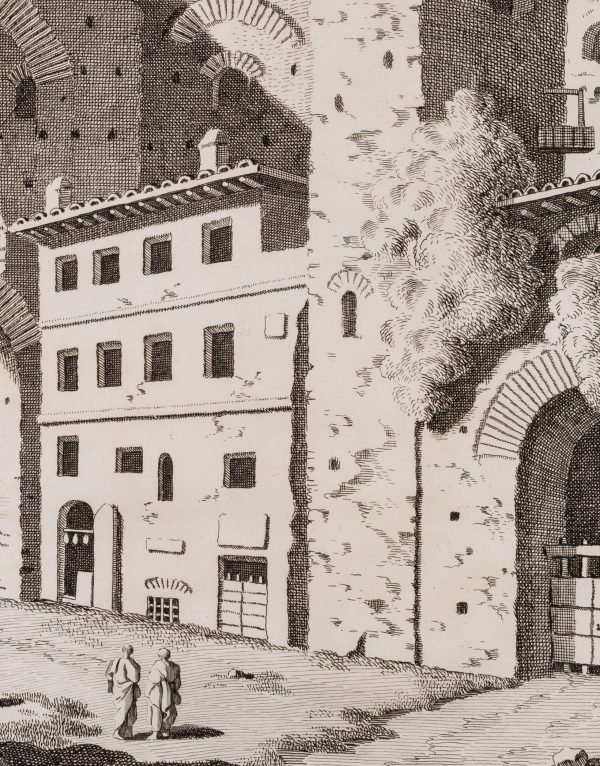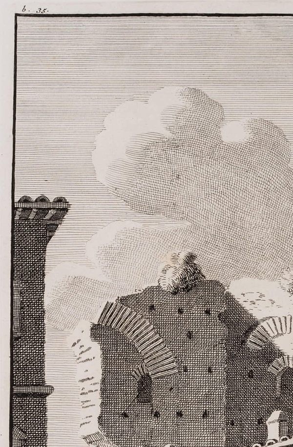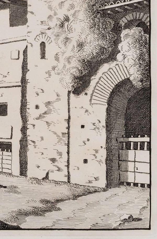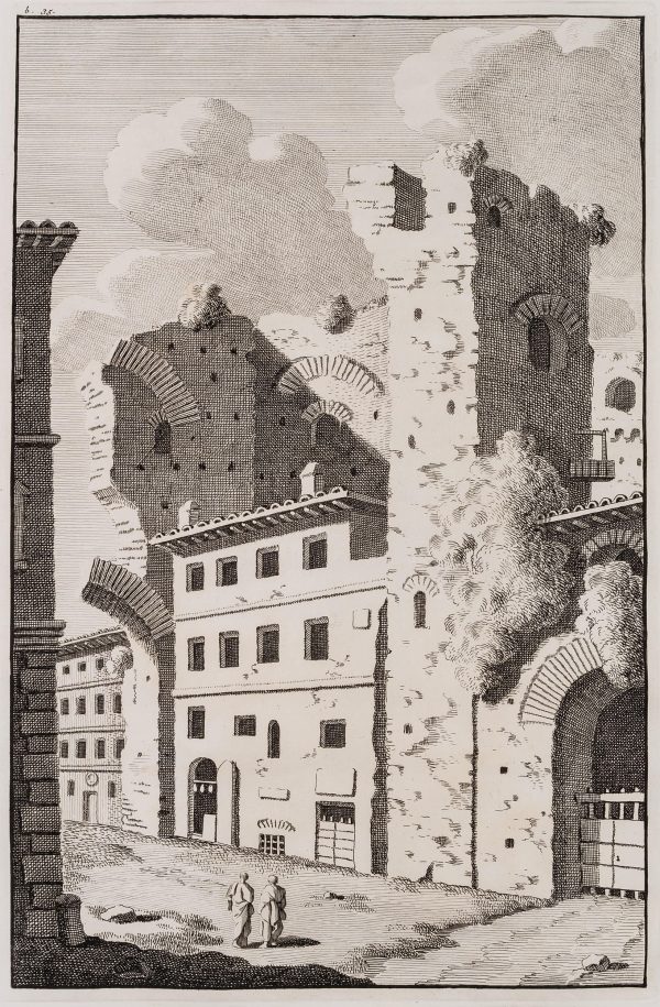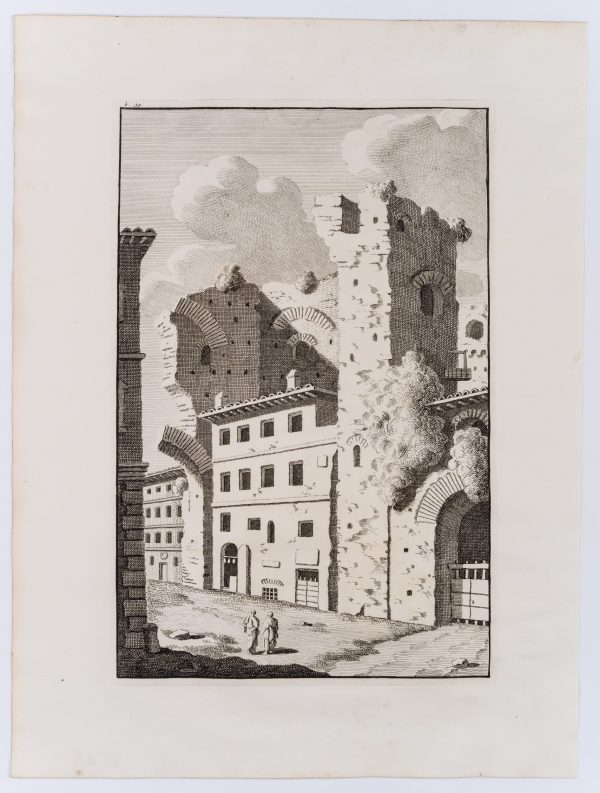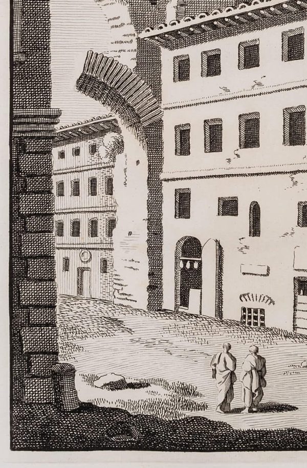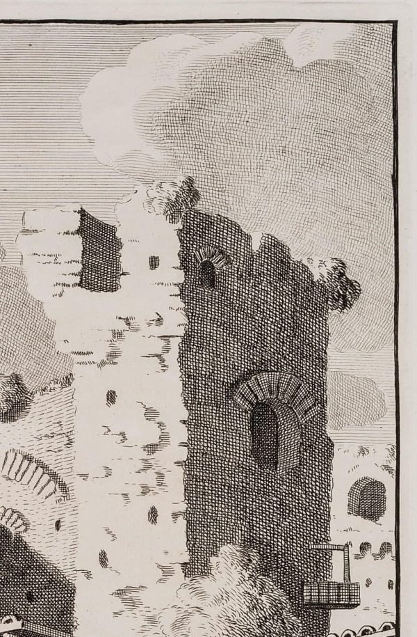 - Description: Beautiful architectural illustration from the French-language compendium of Bonaventura van Overbeke with Roman buildings of antiquity. The large engraving work first appeared in Latin in 1708 and was republished in a French translation in 1709. The etchings were all published posthumously by the artist’s cousin Michiel van Overbeke. They are characterised by a high level of detail in their reproduction. Staffage figures are often added to the architectural views to illustrate the proportions of the ancient monuments.