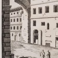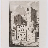 - Beschreibung: Schöne Architekturdarstellung aus dem französischsprachigen Kompendium des Bonaventura van Overbeke mit römischen Bauwerken der Antike. Das große Stichwerk erschien erstmals 1708 in lateinischer Sprache und wurde 1709 in einer französischen Übersetzung erneut herausgegeben. Die Radierungen wurden alle posthum durch den Cousin des Künstlers, Michiel van Overbeke, herausgegeben. Sie zeichnen sich durch eine hohe Detailtreue der Wiedergabe aus. Oftmals sind den architektonischen Ansichten Staffagefiguren beigegeben, die die Größenverhältnisse zu den antiken Monumenten illustrieren.