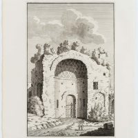 - Beschreibung: Schöne Architekturdarstellung aus dem französischsprachigen Kompendium des Bonaventura van Overbeke mit römischen Bauwerken der Antike. Das große Stichwerk erschien erstmals 1708 in lateinischer Sprache und wurde 1709 in einer französischen Übersetzung erneut herausgegeben. Die Radierungen wurden alle posthum durch den Cousin des Künstlers, Michiel van Overbeke, herausgegeben. Sie zeichnen sich durch eine hohe Detailtreue der Wiedergabe aus. Oftmals sind den architektonischen Ansichten Staffagefiguren beigegeben, die die Größenverhältnisse zu den antiken Monumenten illustrieren.