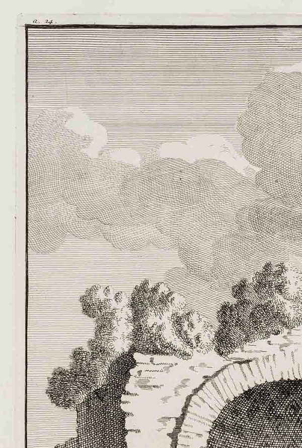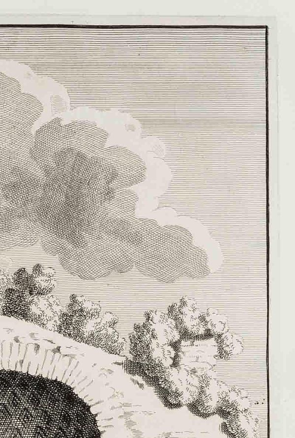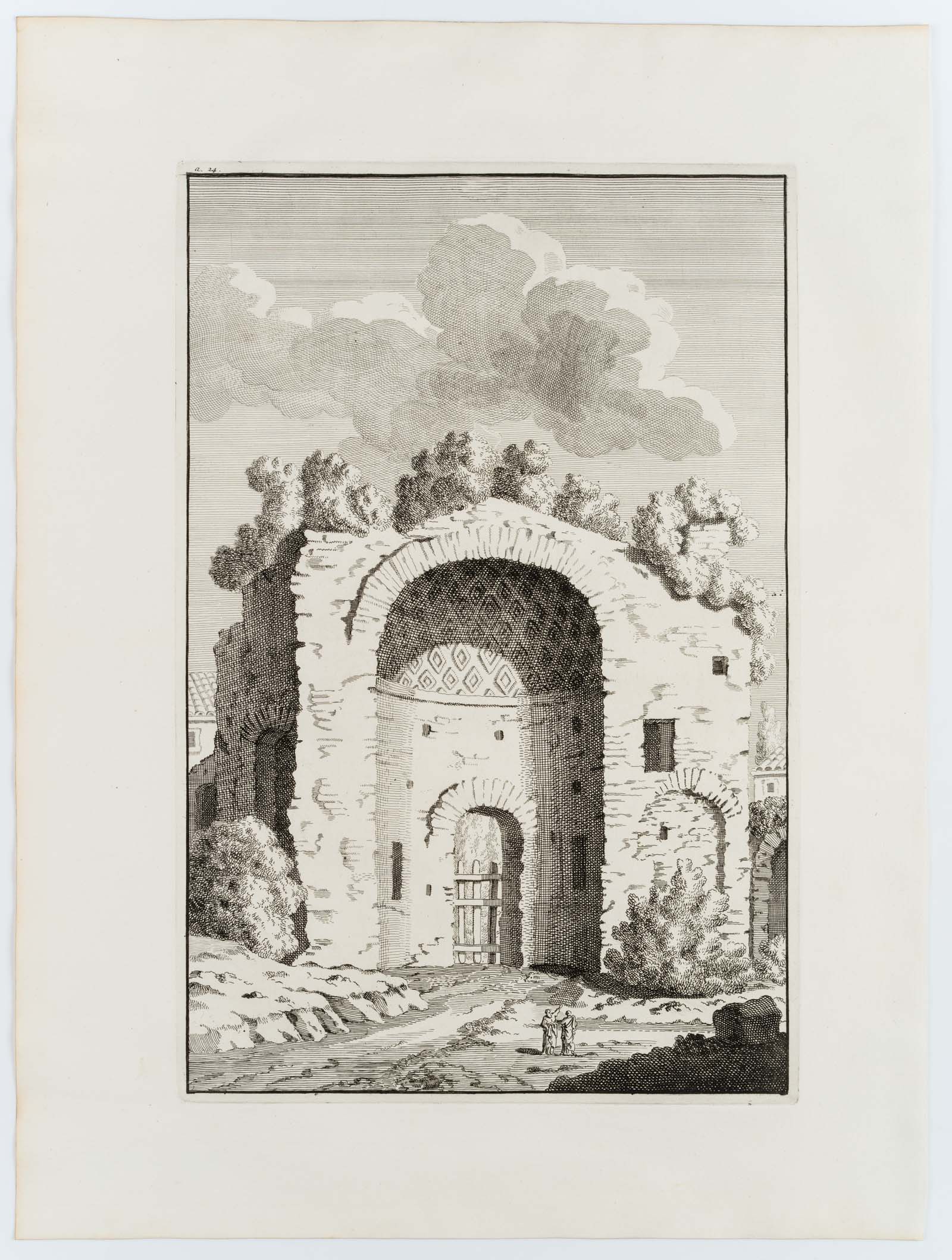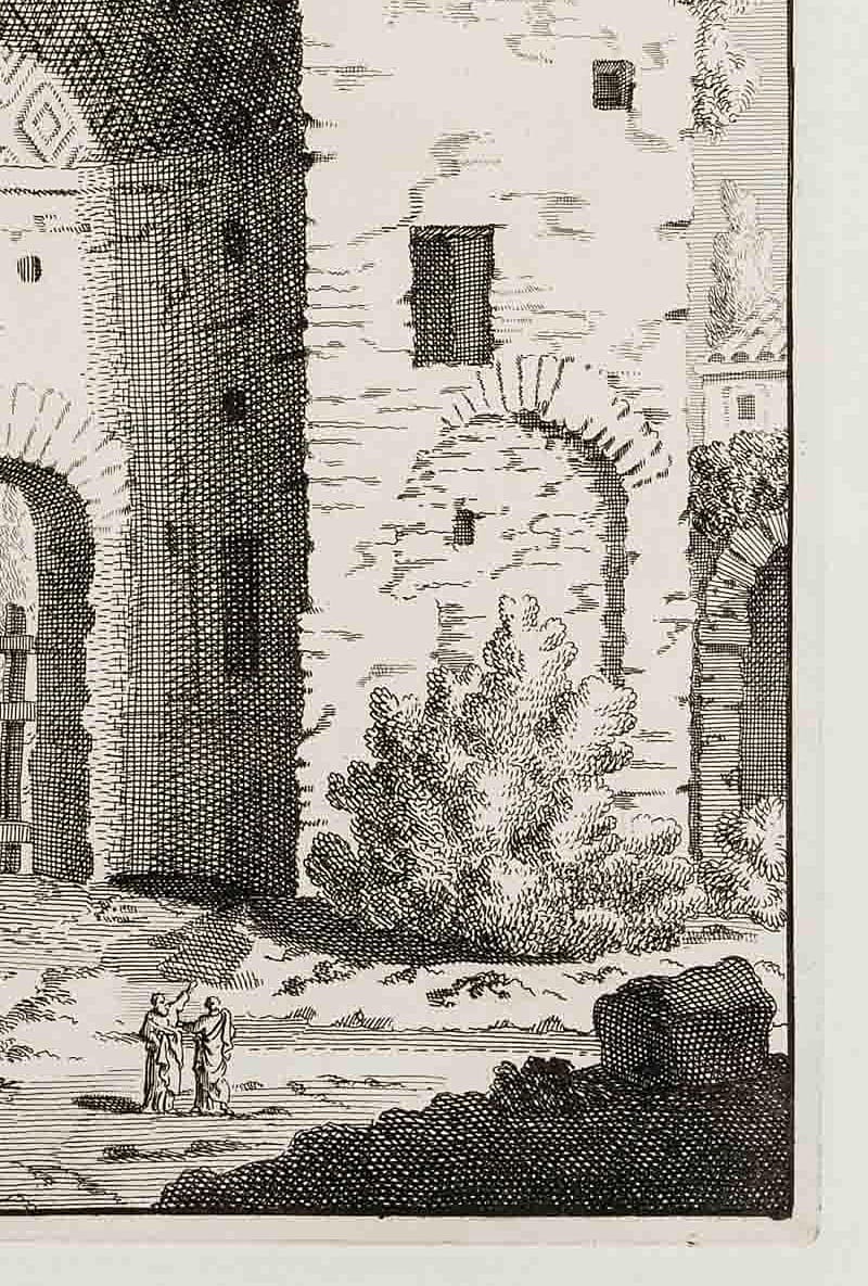 - Description: Beautiful architectural illustration from the French-language compendium of Bonaventura van Overbeke with Roman buildings of antiquity. The large engraving work first appeared in Latin in 1708 and was republished in a French translation in 1709. The etchings were all published posthumously by the artist’s cousin Michiel van Overbeke. They are characterised by a high level of detail in their reproduction. Staffage figures are often added to the architectural views to illustrate the proportions of the ancient monuments.
