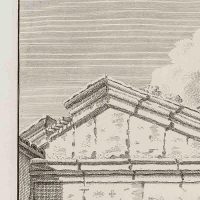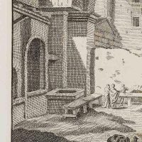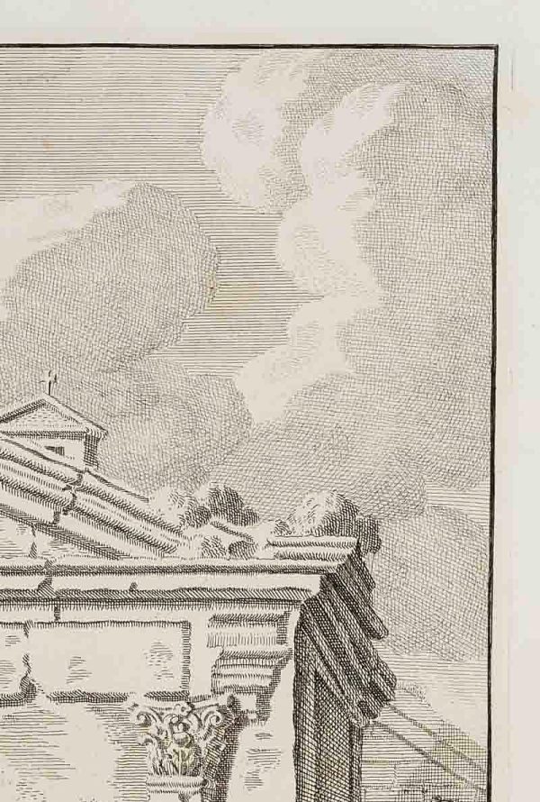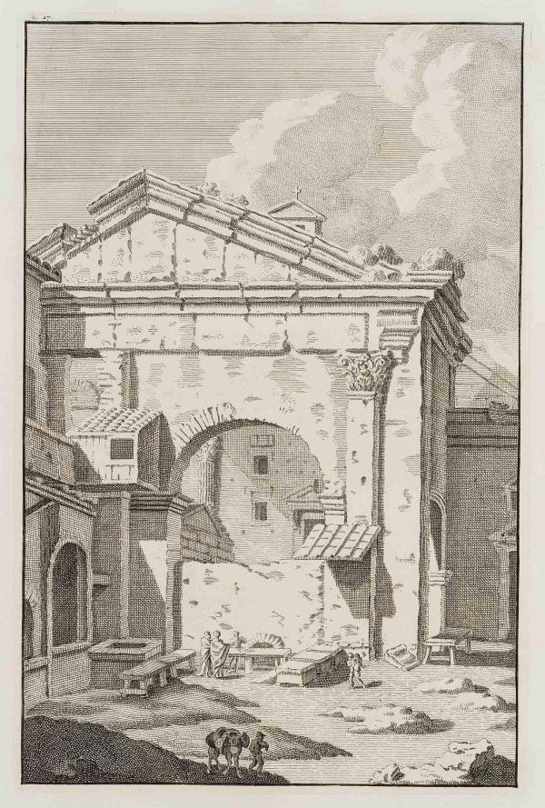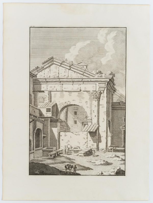 - Beschreibung: Schöne Architekturdarstellung aus dem französischsprachigen Kompendium des Bonaventura van Overbeke mit römischen Bauwerken der Antike. Das große Stichwerk erschien erstmals 1708 in lateinischer Sprache und wurde 1709 in einer französischen Übersetzung erneut herausgegeben. Die Radierungen wurden alle posthum durch den Cousin des Künstlers, Michiel van Overbeke, herausgegeben. Sie zeichnen sich durch eine hohe Detailtreue der Wiedergabe aus. Oftmals sind den architektonischen Ansichten Staffagefiguren beigegeben, die die Größenverhältnisse zu den antiken Monumenten illustrieren.