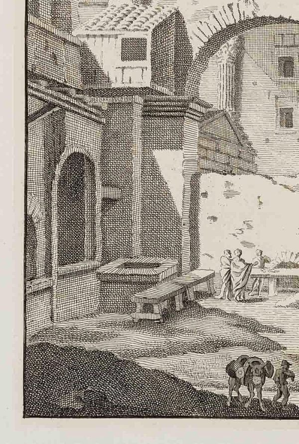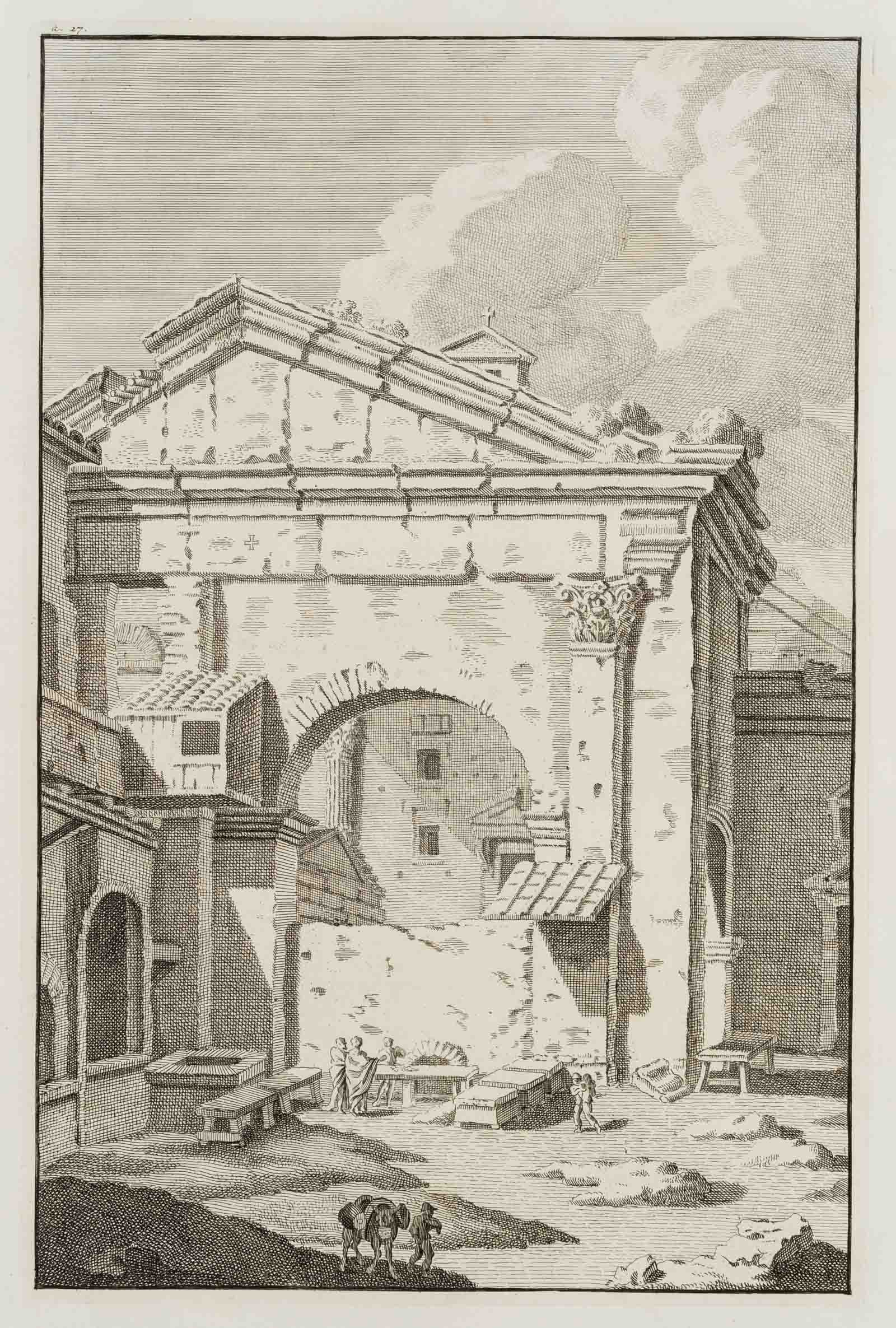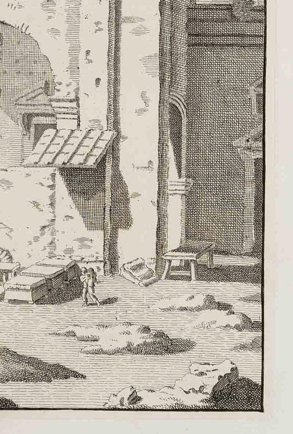 - Description: Beautiful architectural illustration from the French-language compendium of Bonaventura van Overbeke with Roman buildings of antiquity. The large engraving work first appeared in Latin in 1708 and was republished in a French translation in 1709. The etchings were all published posthumously by the artist’s cousin Michiel van Overbeke. They are characterised by a high level of detail in their reproduction. Staffage figures are often added to the architectural views to illustrate the proportions of the ancient monuments.