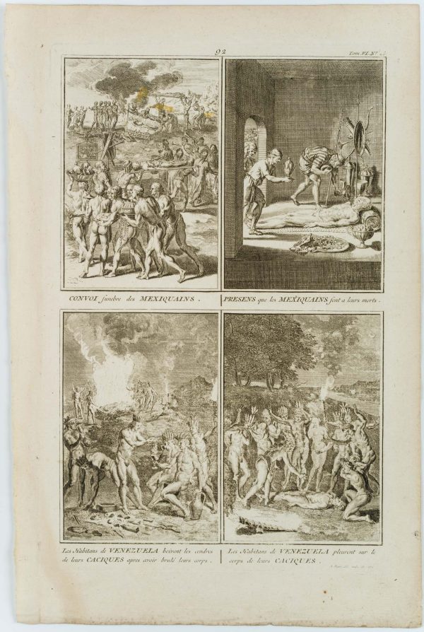 - Description: Four illustrations on one page show funeral customs in Mexico. Page from the book by the French author and publisher Jean Frédéric Bernard (1680 Velaux, Provence – 1744 Amsterdam) published in 1723: “Cérémonies et coûtumes religieuses de tous les peuples du monde représentés par des figures dessinées par Bernard Picart”. The seven-volume folio edition on the ceremonies and cultic expressions of all known religions was a bestseller of the Age of Enlightenment despite its high price. It was above all Bernard Picart’s illustrations, which were popular with the public, that gave the work its special significance. The French engraver and book illustrator Bernard Picart (1673 Paris – 1733 Amsterdam) studied drawing at the Académie Royale; in 1696 he went to the Academy in Antwerp and in 1698 to Amsterdam, where he worked as a book illustrator. In 1702 he married in Paris, where he worked mainly as an engraver. Titled “Convoi funebre des Mexiquains / Presens que les Mexiquains font a leurs morts / Les Habitans de Venezuela boivent les cendres …” below each of the four illustrations. / Les Habitans de Venezuela pleurent …”; signed and dated on the right below the lower image; numbered “92” in the centre above the upper image and inscribed “Tom. VI. No. 23”.