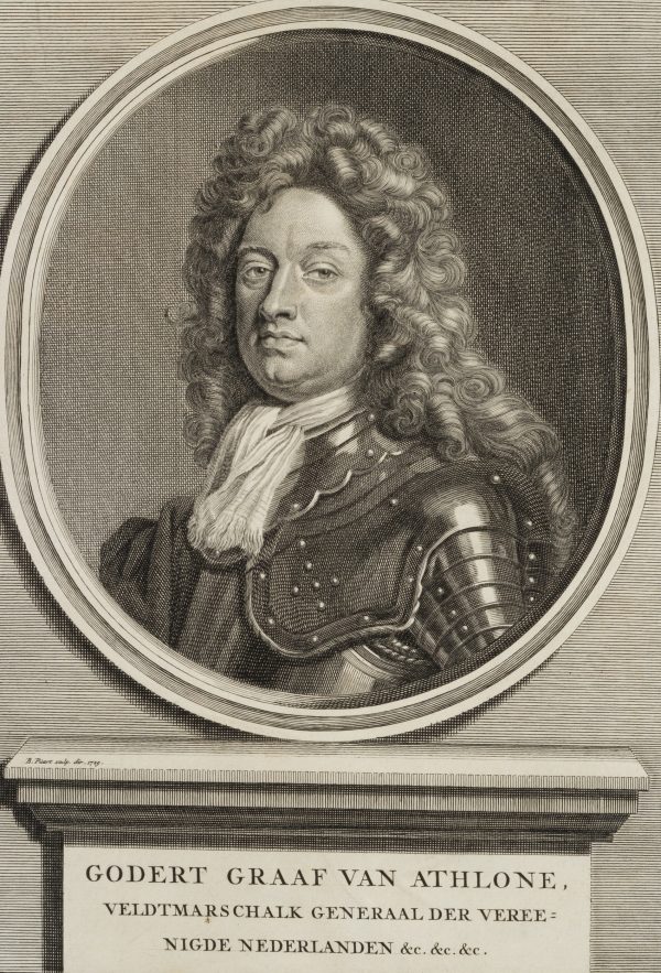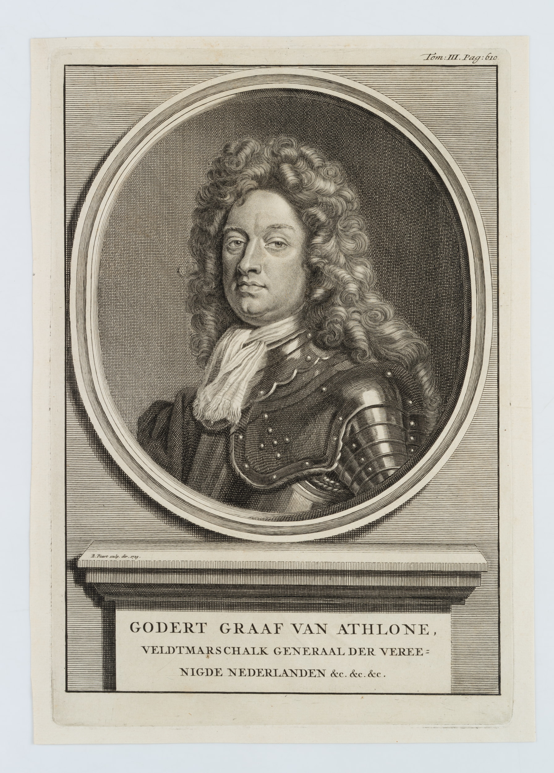- Bezeichnung: Mittig links im Druck signiert: “B. Picart sculp. dir. 1729.”. Unten mittig im Druck bezeichnet: “GODERT GRAAF VAN ATHLONE, VELDTMARSCHALK GENERAAL DER VEREE= NIGDE NEDERLANDEN &c. &c. &c.”.
