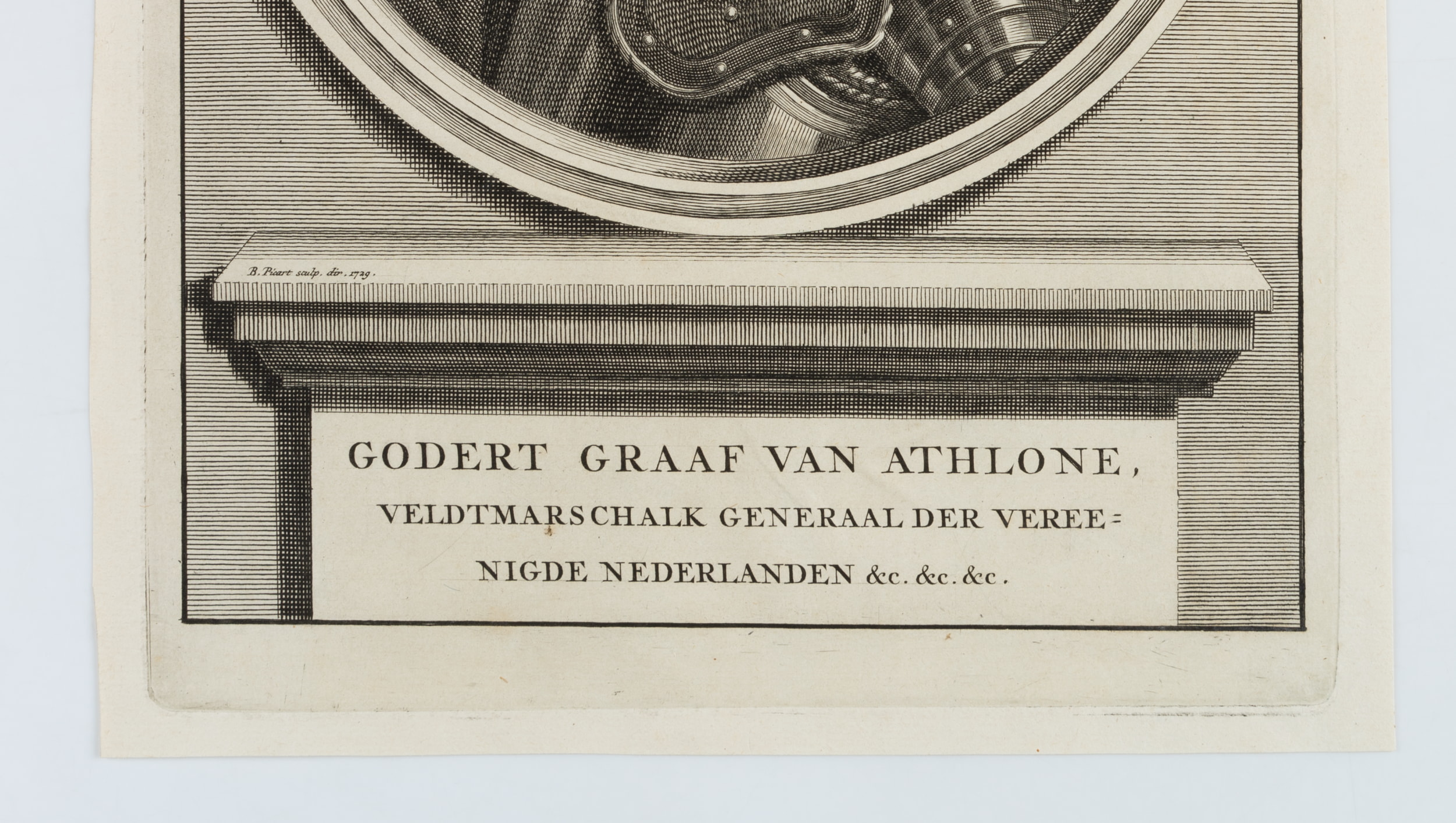 - Inscription: Middle left signed in the printing plate: “B. Picart sculp. dir. 1729.”. Lower middle inscribed in the printing plate: “GODERT GRAAF VAN ATHLONE, VELDTMARSCHALK GENERAAL DER VEREE= NIGDE NEDERLANDEN &c. &c. &c.”.