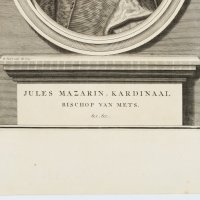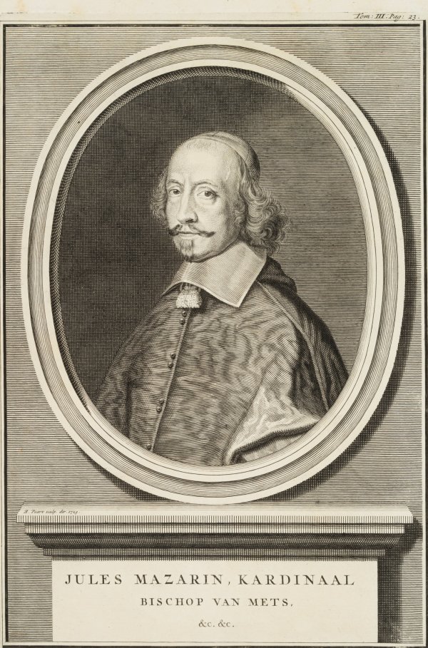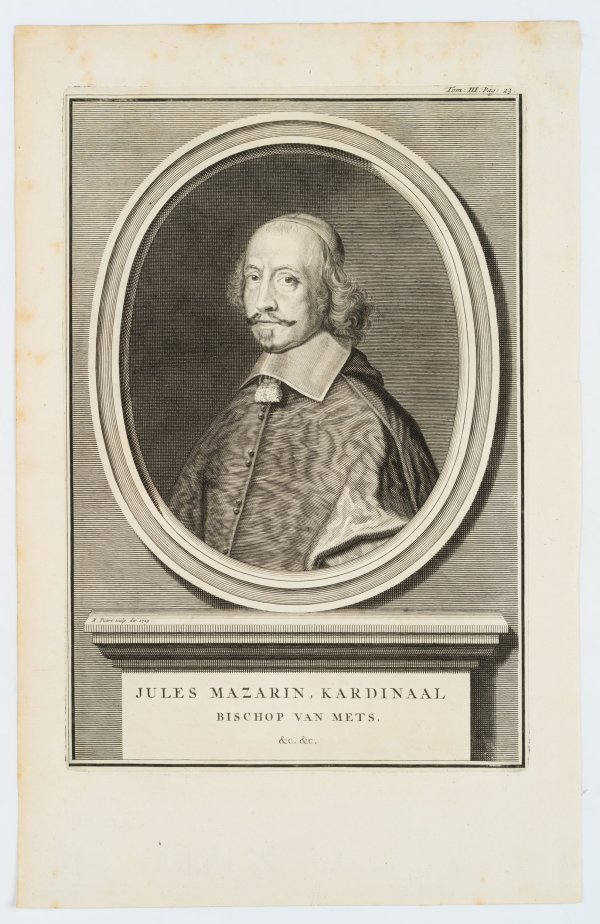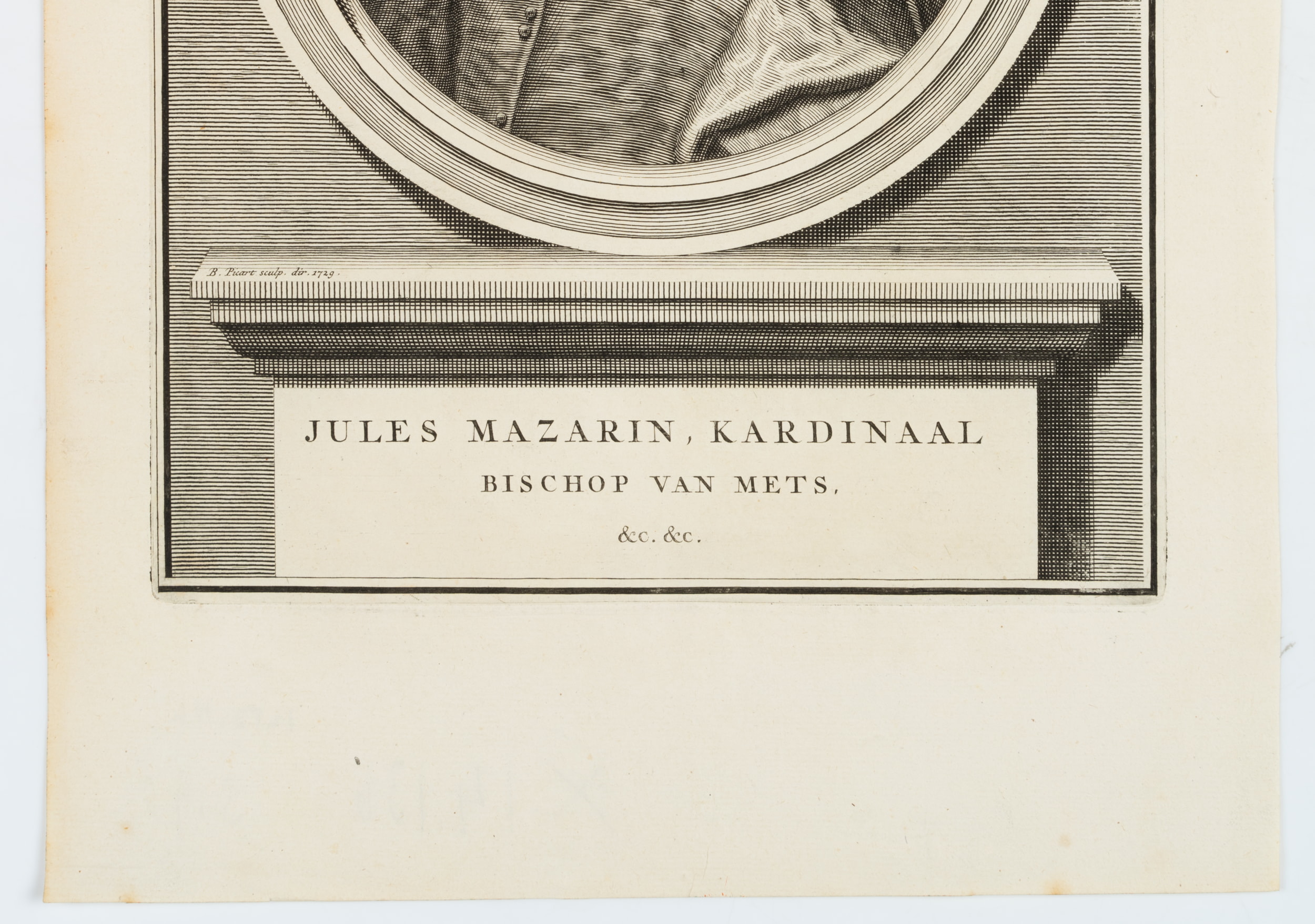 - Inscription: Middle left signed in the printing plate: “B. Picart sculp. dir. 1729.”. Lower middle inscribed in the printing plate: “JULES MAZARIN, KARDINAAL | Bischop Van Mets.”. Upper right numbered in the printing plate: “Tom: III. Pag: 23.”.