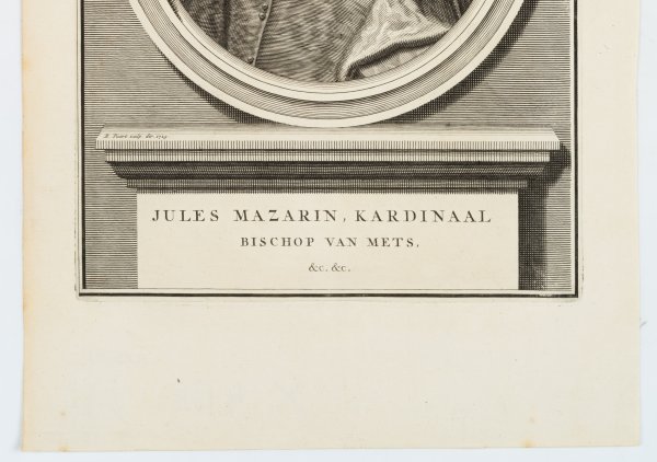 - Bezeichnung: Mittig links im Druck signiert: “B. Picart sculp. dir. 1729.”. Unten mittig im Druck bezeichnet: “JULES MAZARIN, KARDINAAL | Bischop Van Mets.”. Oben rechts im Druck nummeriert: “Tom: III. Pag: 23.”.
