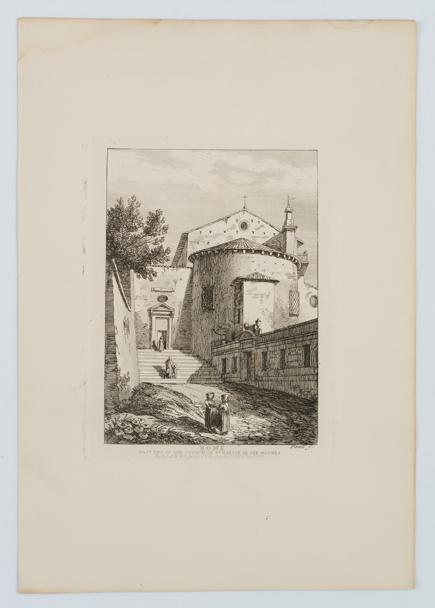 - Inscription: Lower right signed in the printing plate: “Pinelli f.”. Lower middle inscribed in the printing plate: “Rome. East End of the church of St. Martin in the Mounts.”. Lower right dated: “London May 1,1833”.