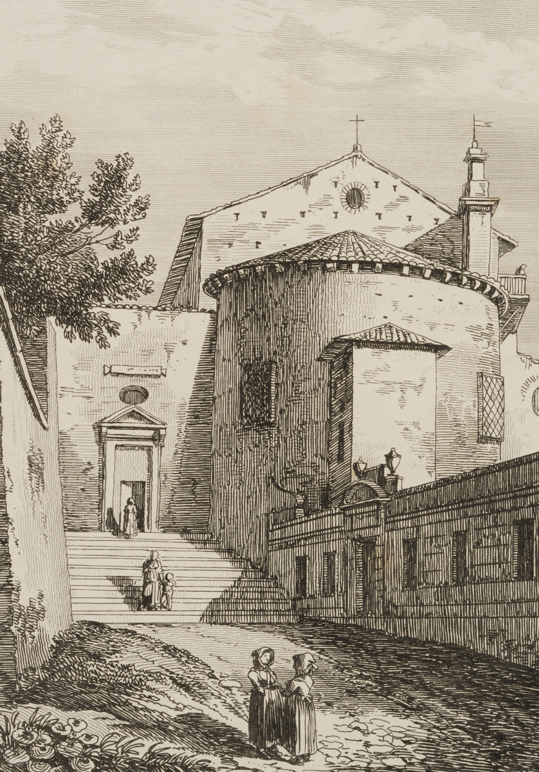 Bartolomeo Pinelli (1781 Rom – 1835 ebd.), Ostseite mit Apsis der Basilika Santi Silvestro e Martino ai Monti, 1833, Radierung