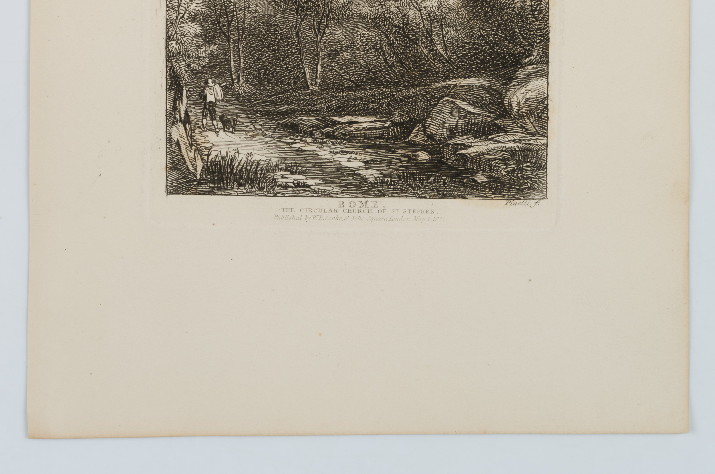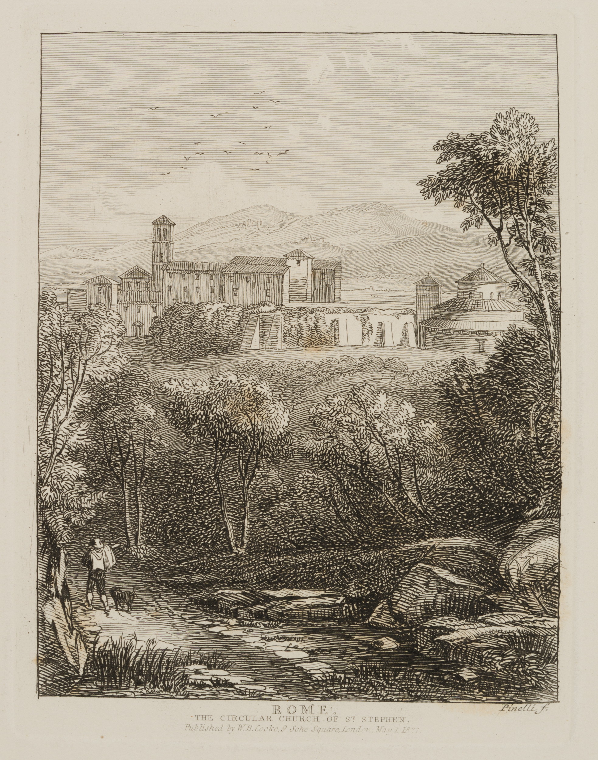 - Bezeichnung: Unten rechts im Druck signiert: “Pinelli f.”. Unten mittig im Druck bezeichnet: “Rome. The circular church of St. Stephen.”.