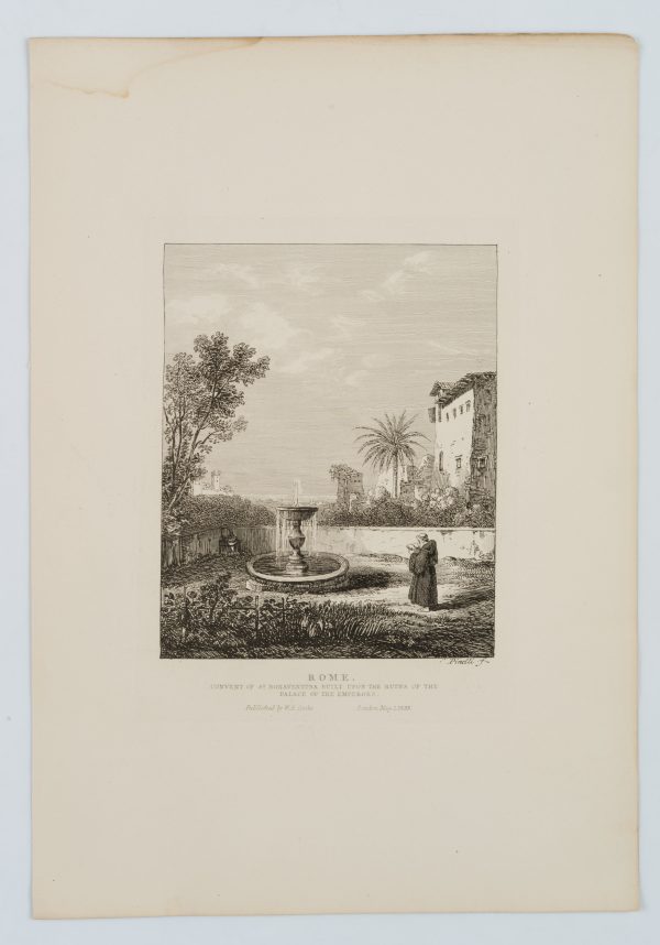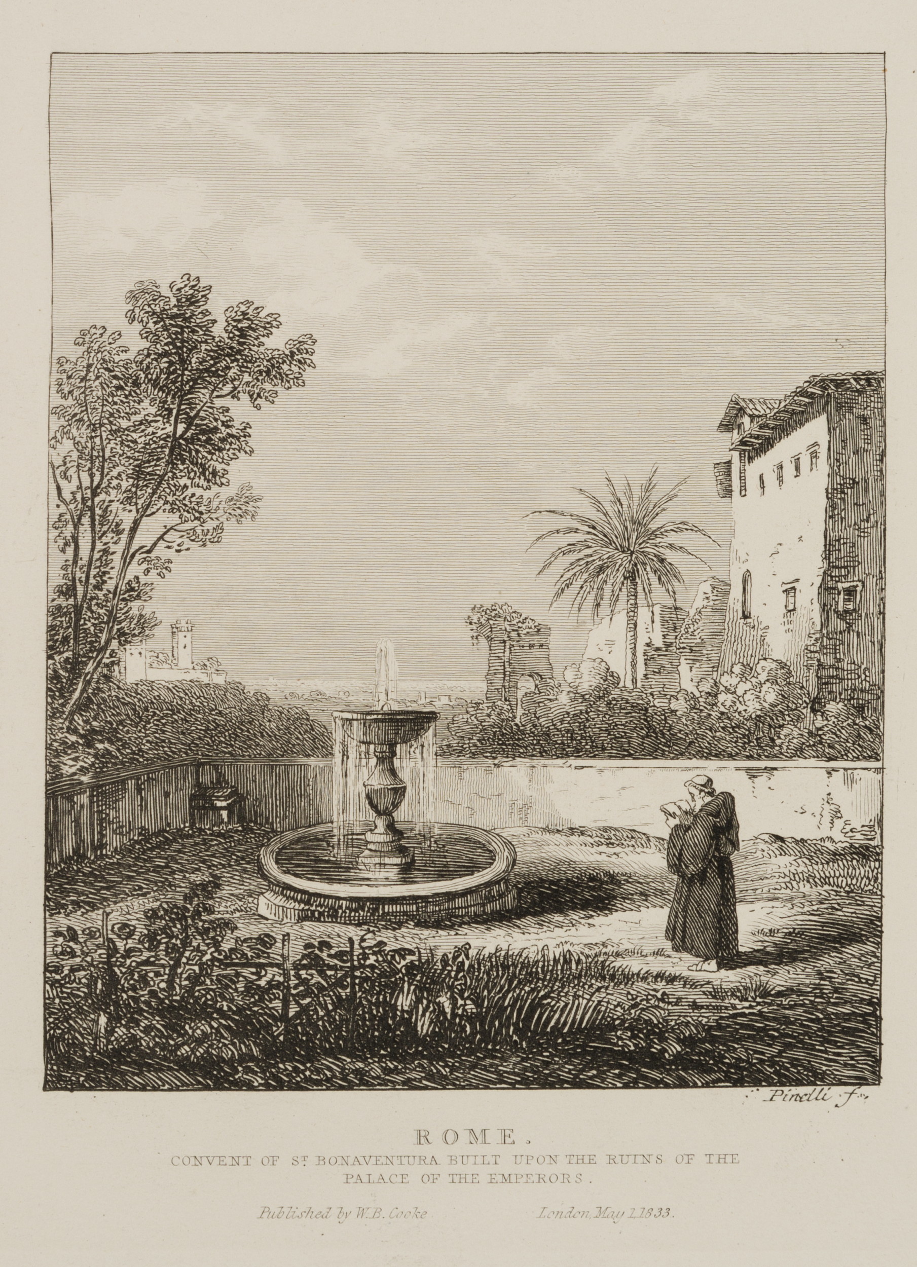 - Inscription: Lower right signed in the printing plate: “Pinelli Sc.”. Lower middle inscribed in the printing plate: “Rome. Convent of St. Bonaventura built upon the ruins of the palace of the emperors”.