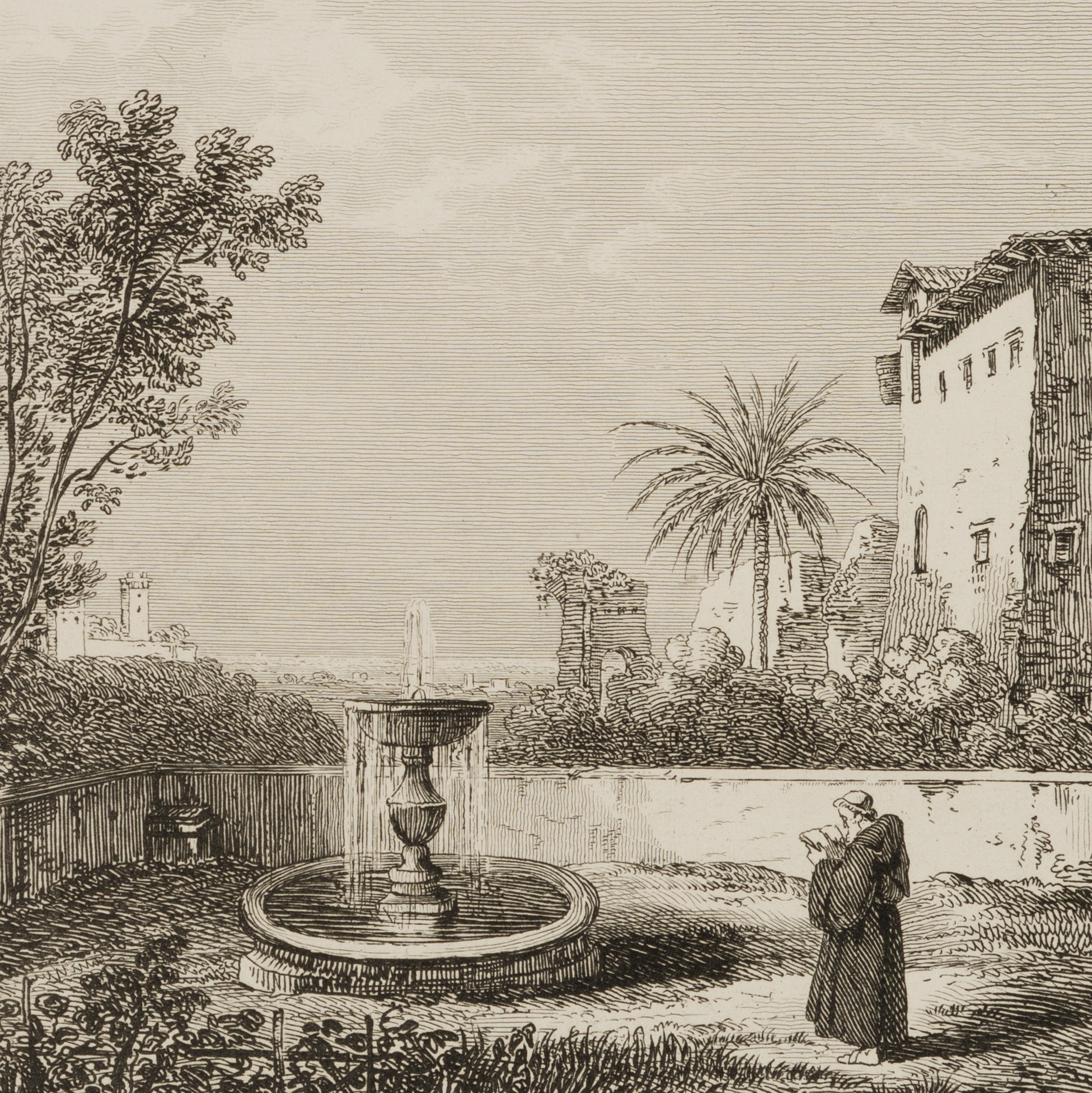 Bartolomeo Pinelli (1781 Rom – 1835 ibid.), Monastery garden of Bonaventure with Franciscan monk reading, Rome, 1833, Etching