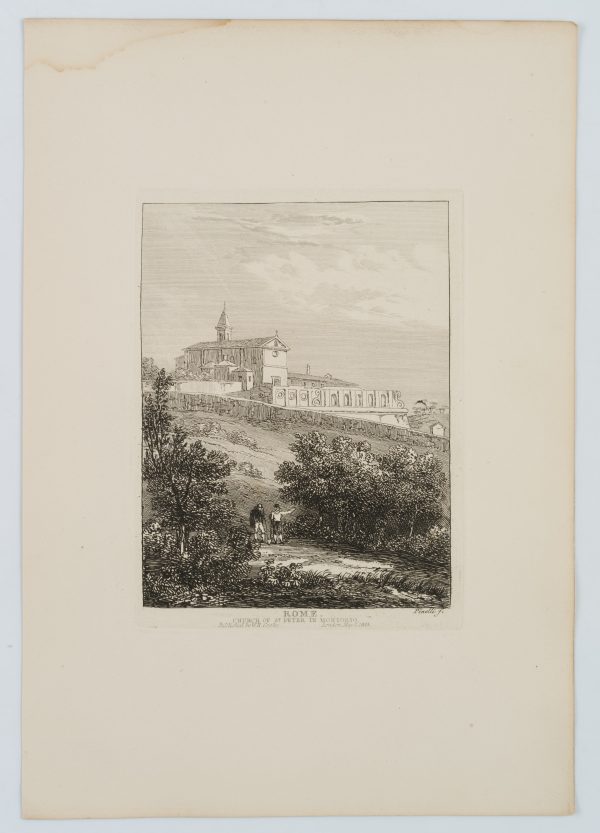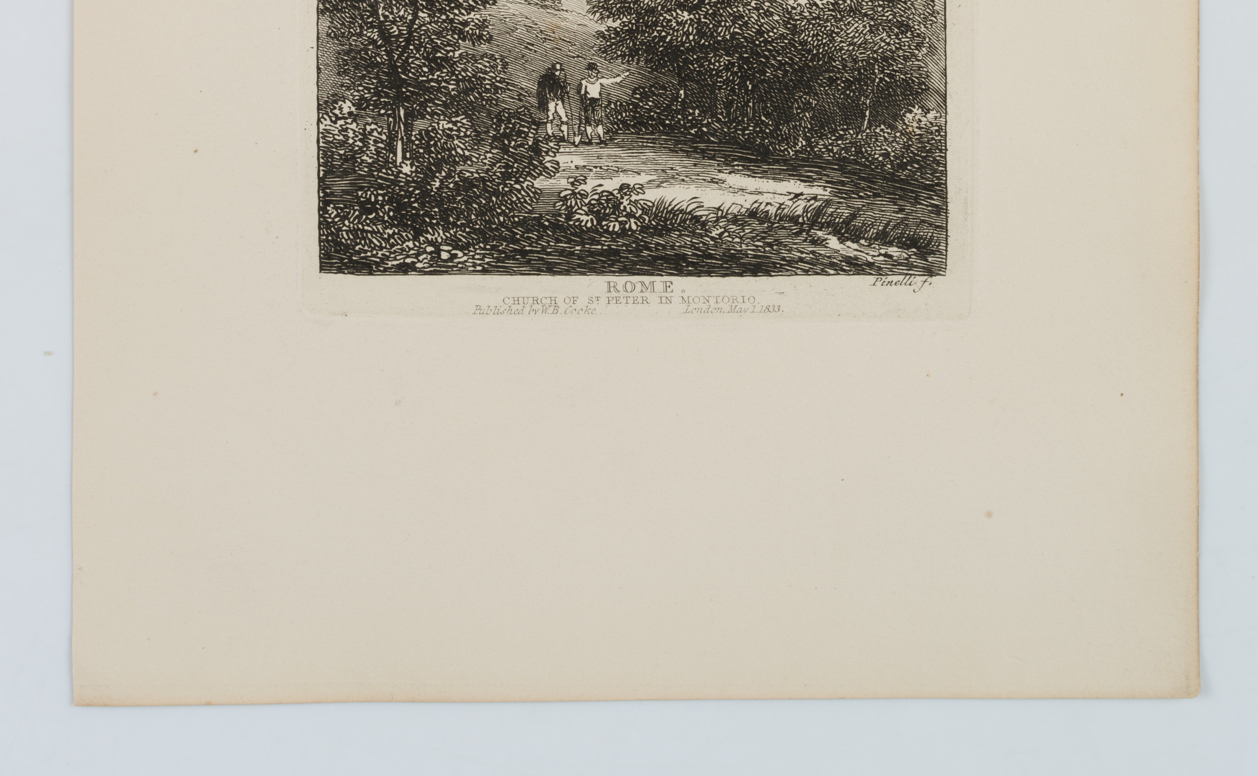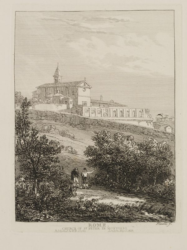 - Inscription: Lower right signed in the printing plate: “Pinelli f.”. Lower middle inscribed in the printing plate: “Rome. Church of St. Peter in Montorio”.
