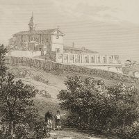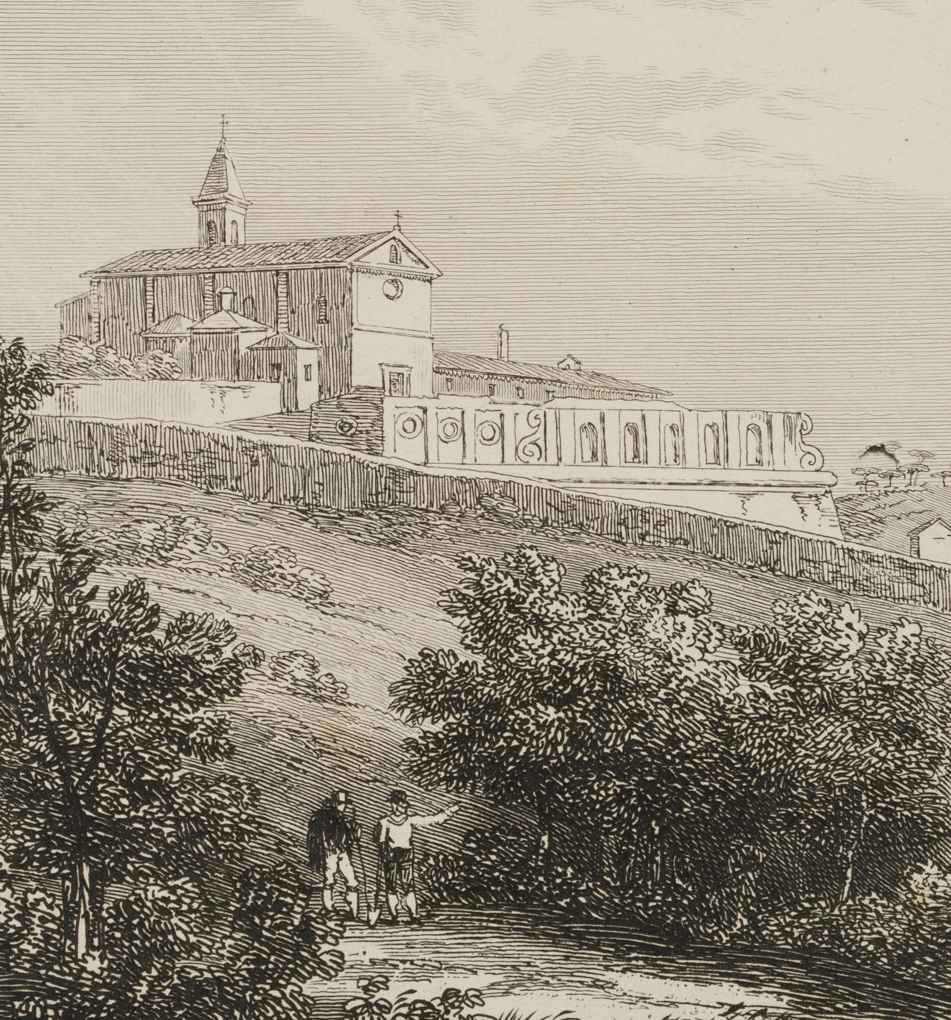 Bartolomeo Pinelli (1781 Rom – 1835 ibid.), View from a country road of the monastery church of San Pietro in Montorio, Rome, 1833, Etching