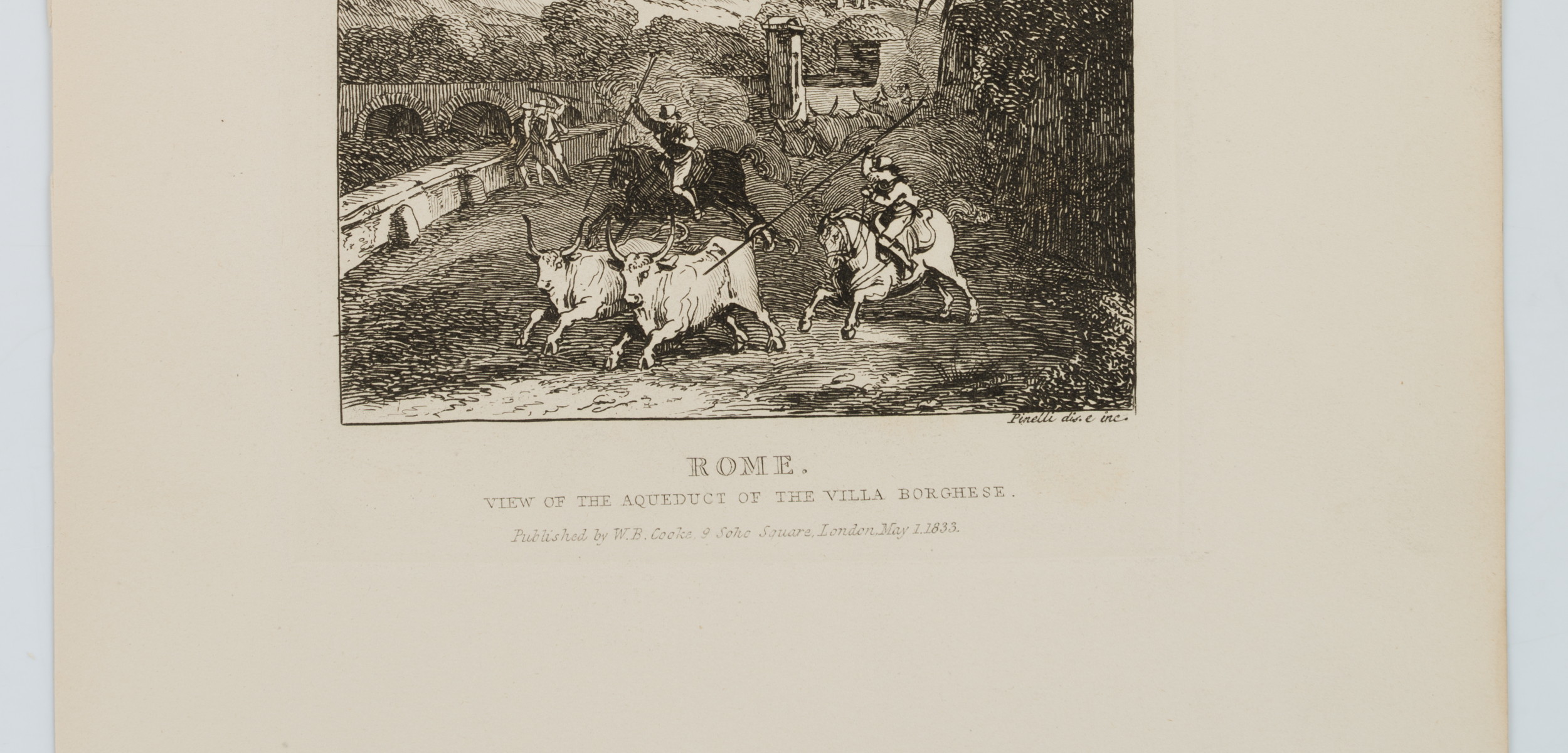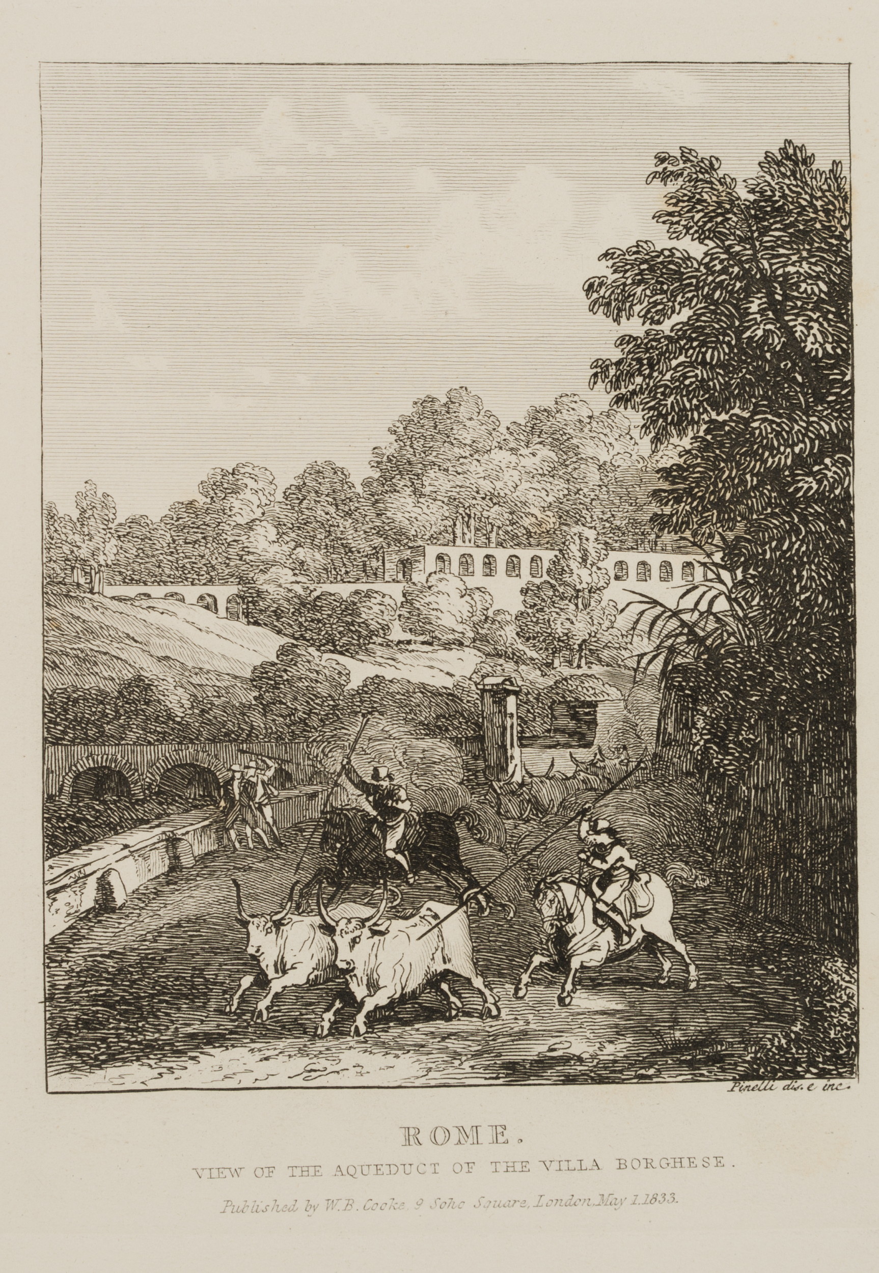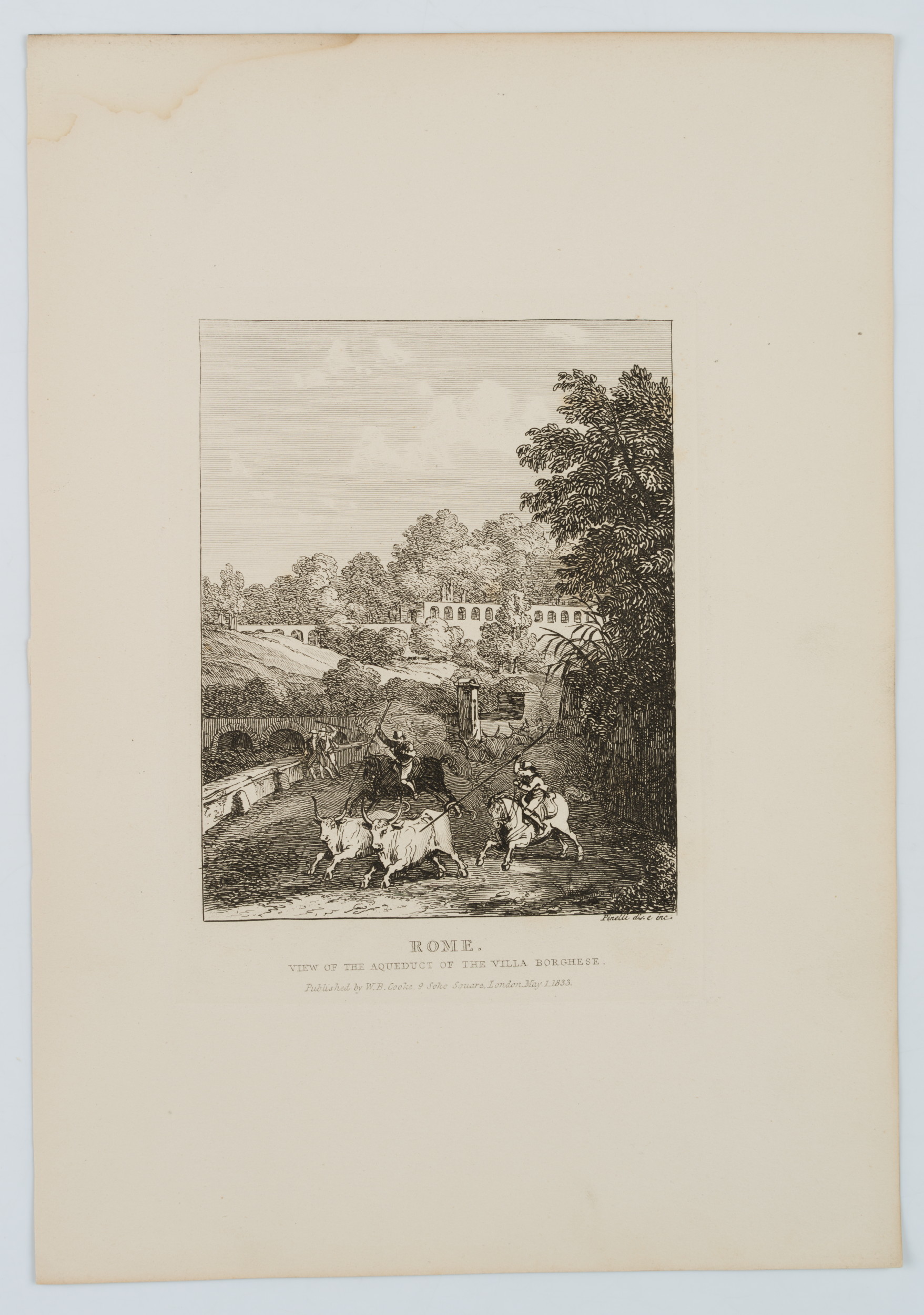 - Inscription: Lower right signed in the printing plate: “Pinelli dis e inc.”. Lower middle inscribed in the printing plate: “Rome. View of the Aqueduct of the Villa Borghese”. Lower middle dated: “London May 1, 1833”.