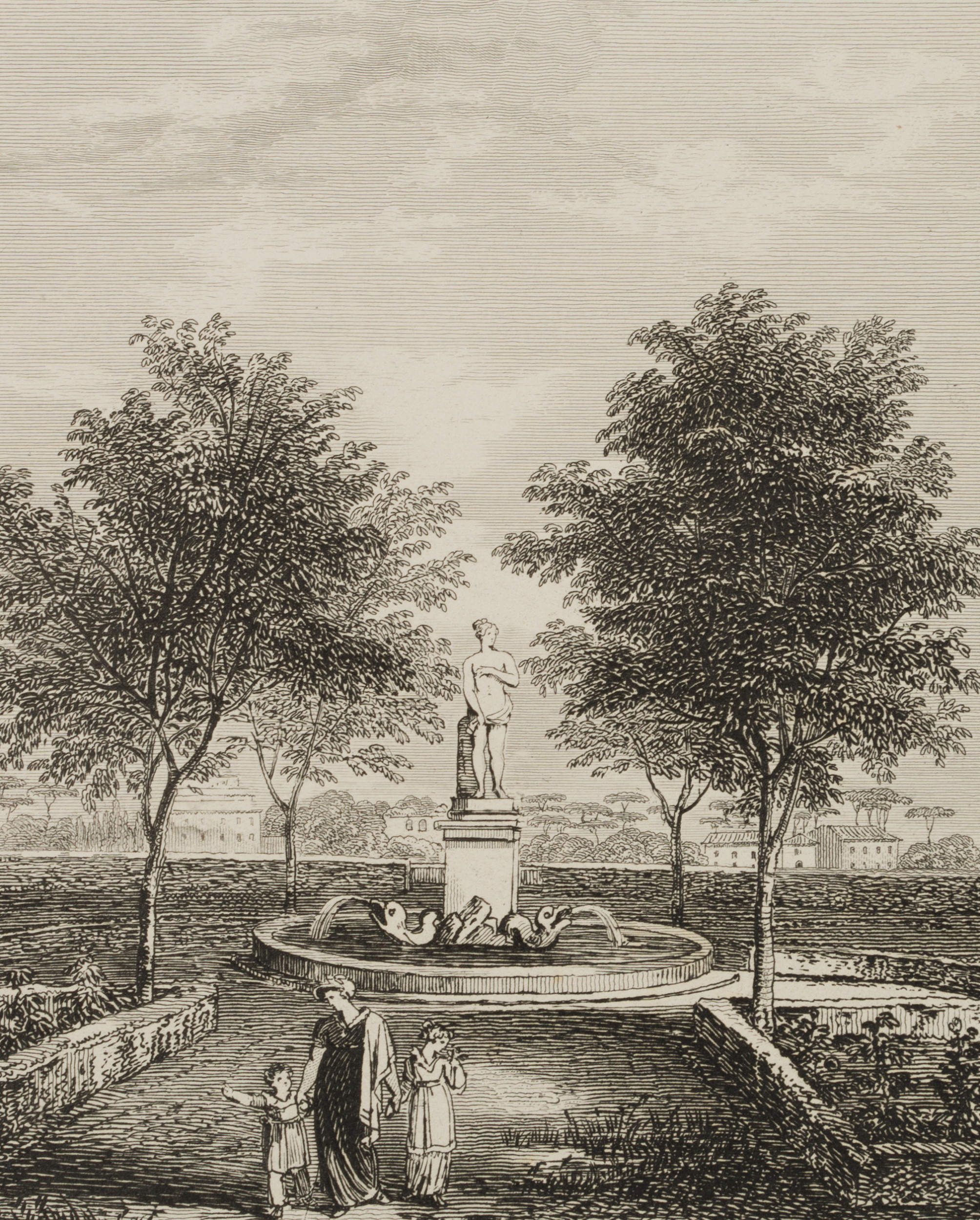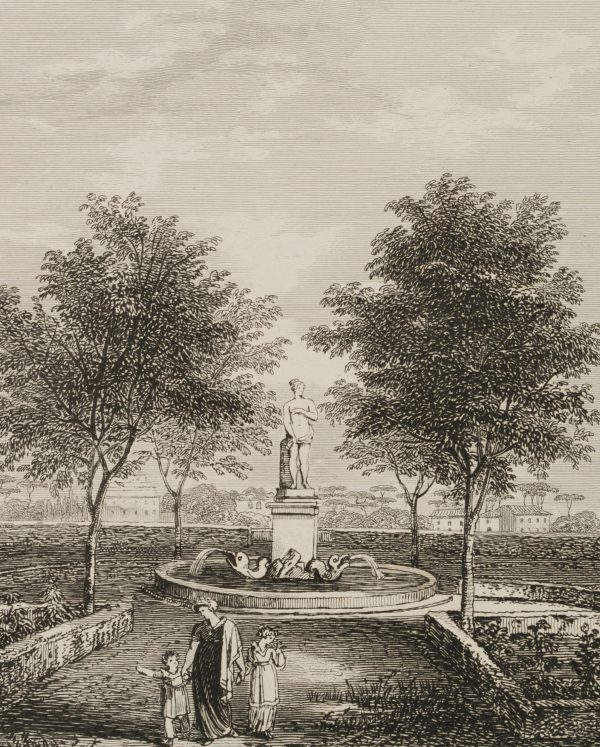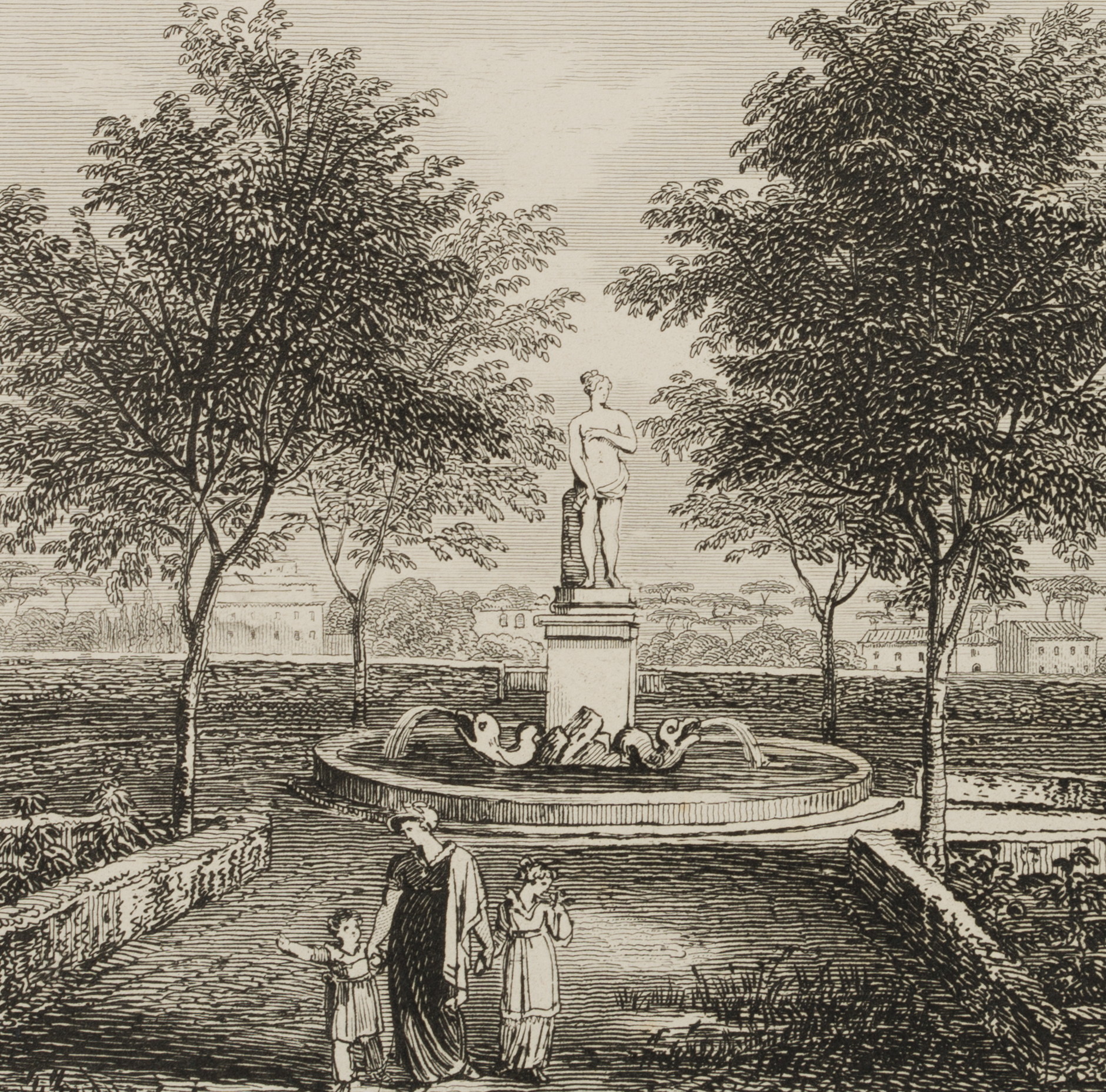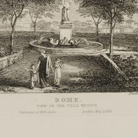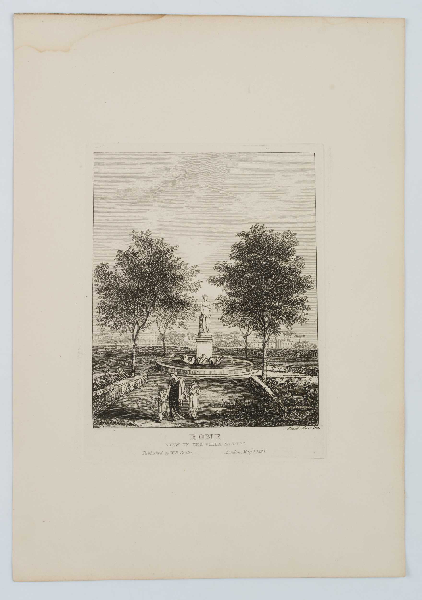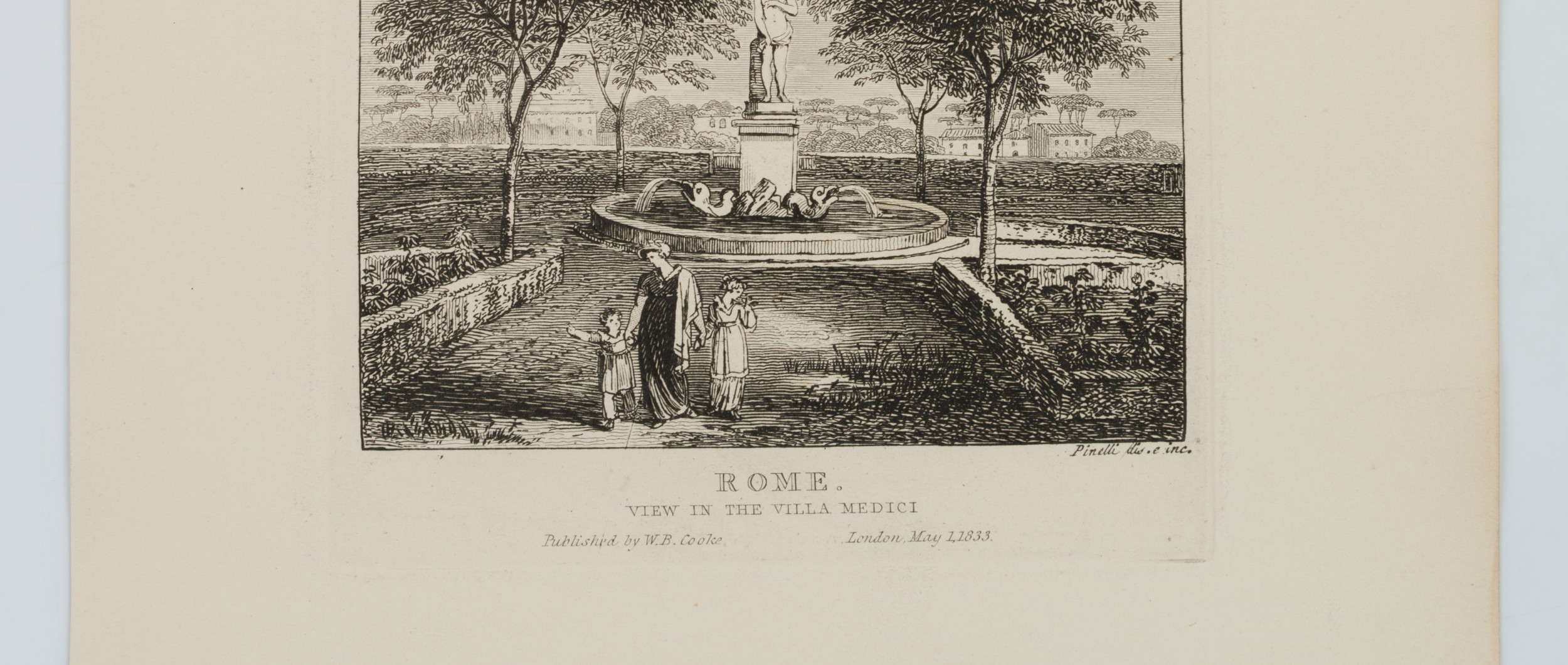 - Inscription: Lower right signed in the printing plate: “Pinelli dis. e inc.”. Lower middle inscribed in the printing plate: “Rome. View in the Villa Medici”. Lower middle dated: “London, May 1,1833”.