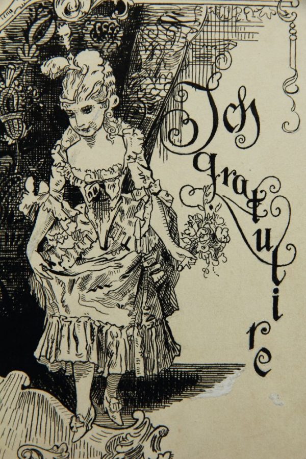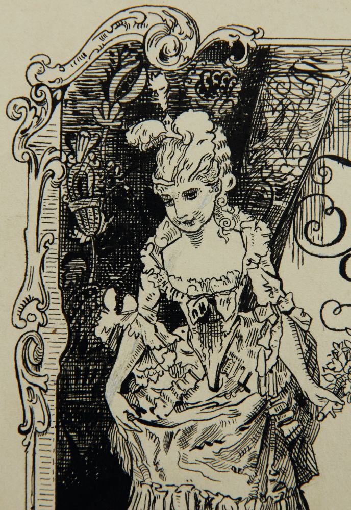 - Schlagworte: Dame in barockem Kleid, Entwurf einer Glückwunschkarte, Mode, Deutschland, Altmeister, 1900-1924