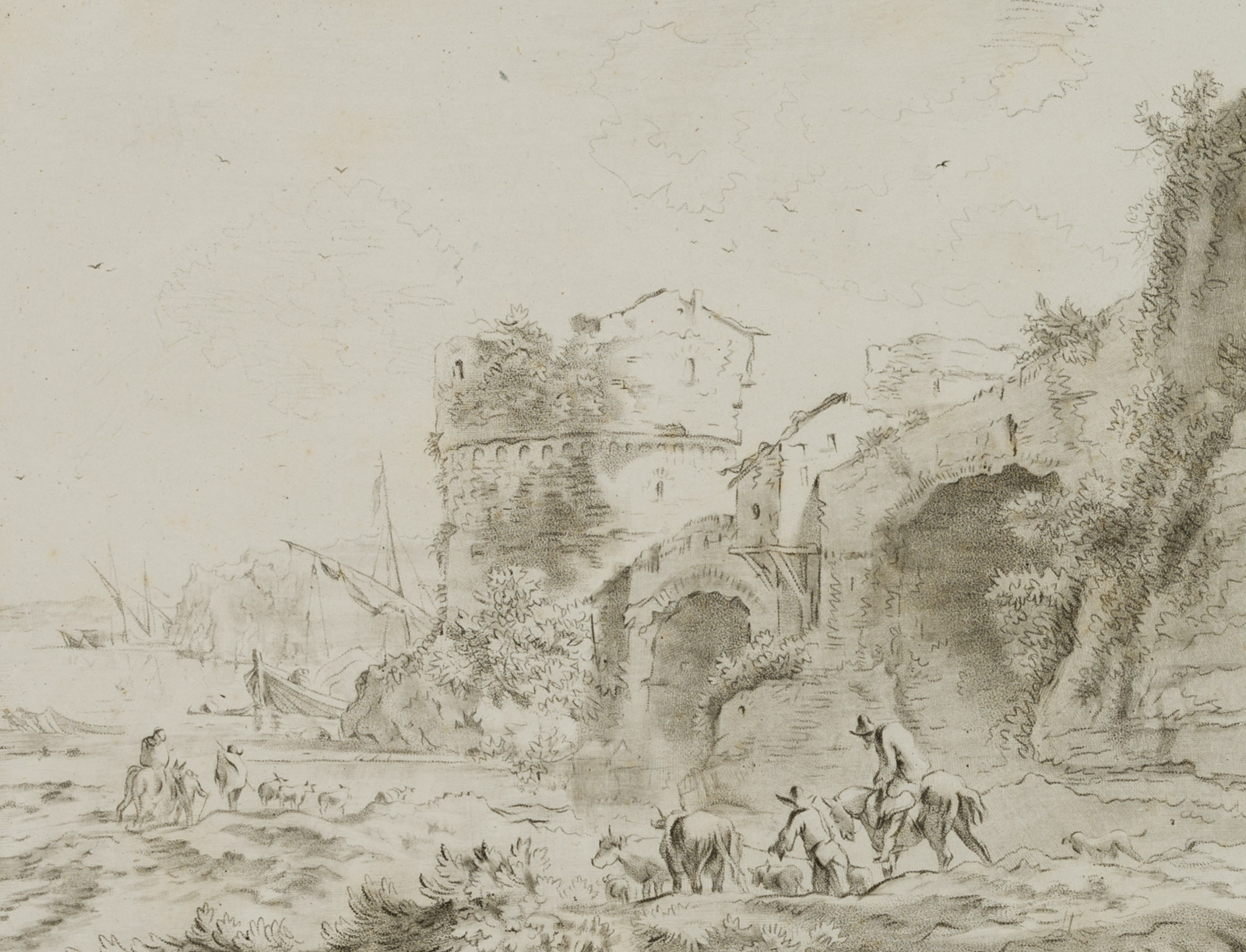 Depiction of a romantic river landscape with bridge and ruined tower; the viewer’s gaze falls directly on the ruins of a round tower in the centre of the depiction-the outpost of a castle; view from the right across a river to the other end of the bridge overgrown with plants; sailing ships on the water and cattle herders on the shore, some on horseback-driving their flocks, form the beautiful staffage of the picturesque landscape; after Nicholaes Berchem. - Date: 1772