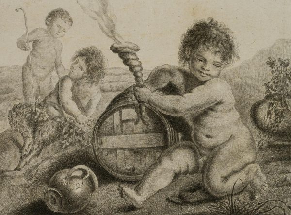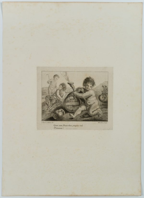 “Wohin, Bacchus, zerrst du mich Betrunkenen?”-Bachus als Cherub sitzt an ein Fass gelehnt, in seiner linken Hand eine gewundene Fackel nach oben haltend. Er lächelt und blickt nach rechts unten. Im Hintergrund ein Faun und Cherub mit gebogenem Stab; auf dem Boden im Vordergrund ein Krug; nach Milani. - Datierung: 1750
