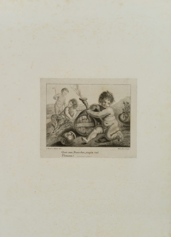 - Bezeichnung: Unterhalb der Darstellung bezeichnet mit dem Vers des Horaz: “Quo me, Bacche, rapis tui / Plenum?”, und “Aurelo. Milani del. / WBaillie Sculp.”.