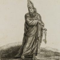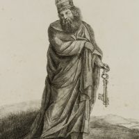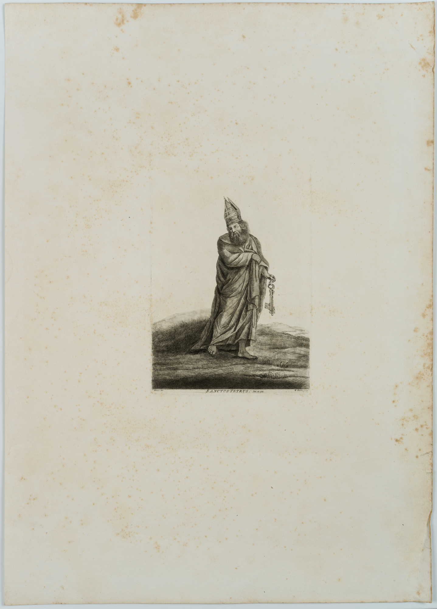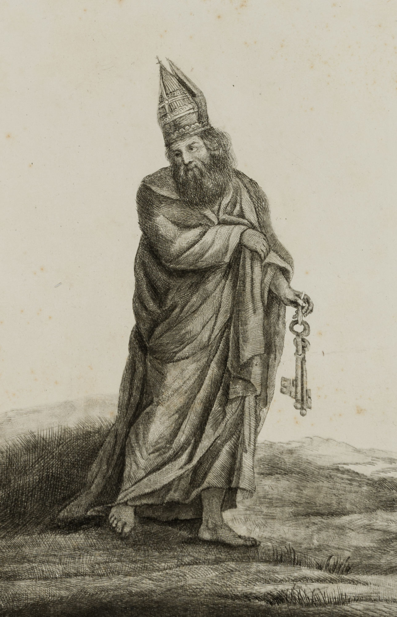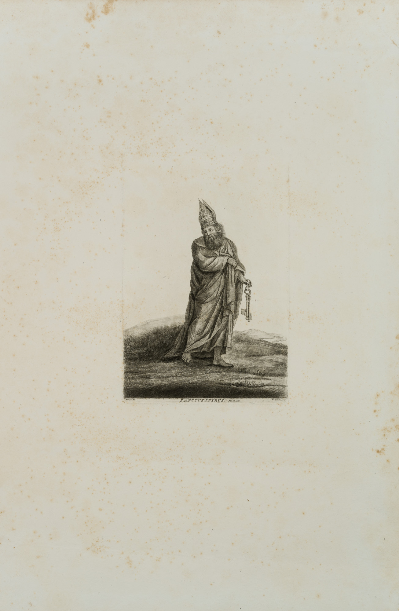 - Description: Inscribed in the plate below the depiction with the title and: “Rubens del / Jan. 18 1785 / W. Baillie sculp”. Imposing full-length depiction of the first bishop of Rome according to tradition: Sanctus Petrus. Wearing a mitre and with a luxuriant beard, he looks over his shoulder into the left area outside the picture field. He lifts the left sleeve of his robe, which gives additional emphasis to the two large keys in his left.